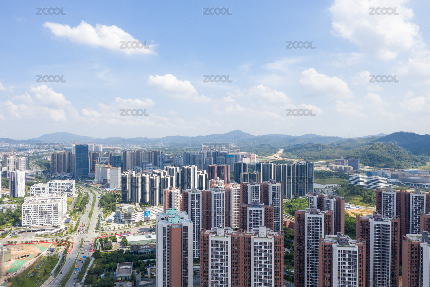蓝天白云下的中国深圳城市郊区住宅建筑及高架桥