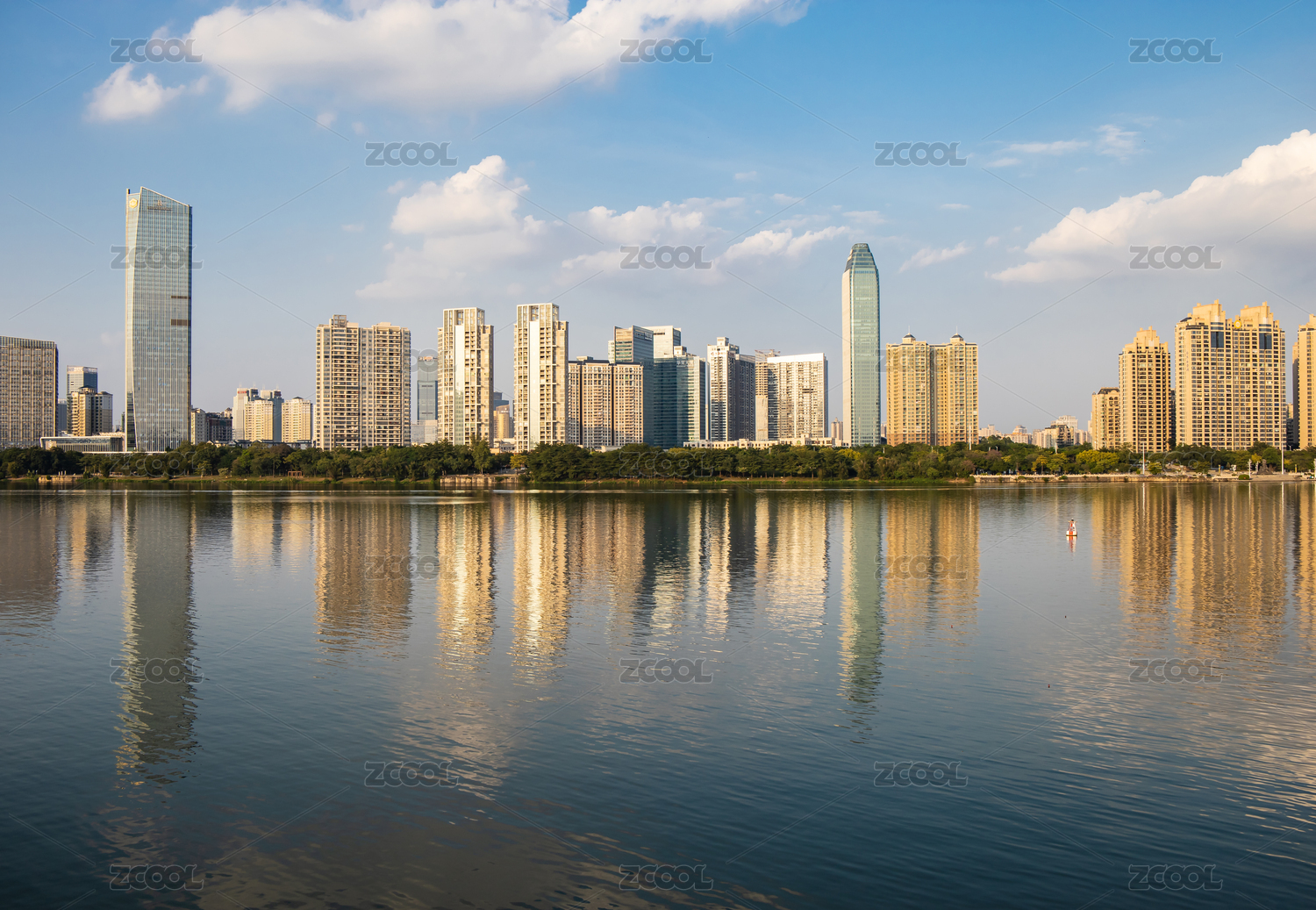 南宁南湖公园夕阳黄昏与城市摩天大楼建筑