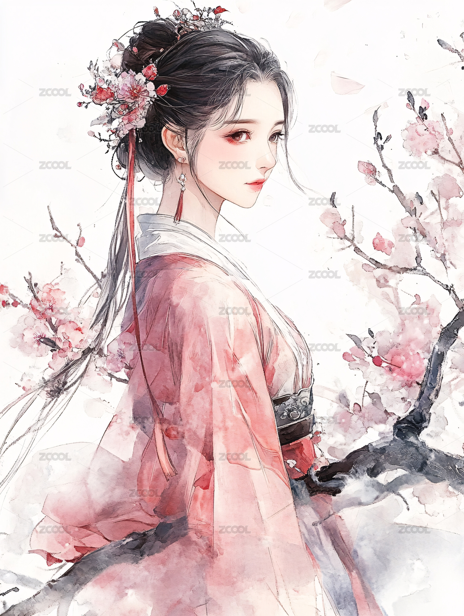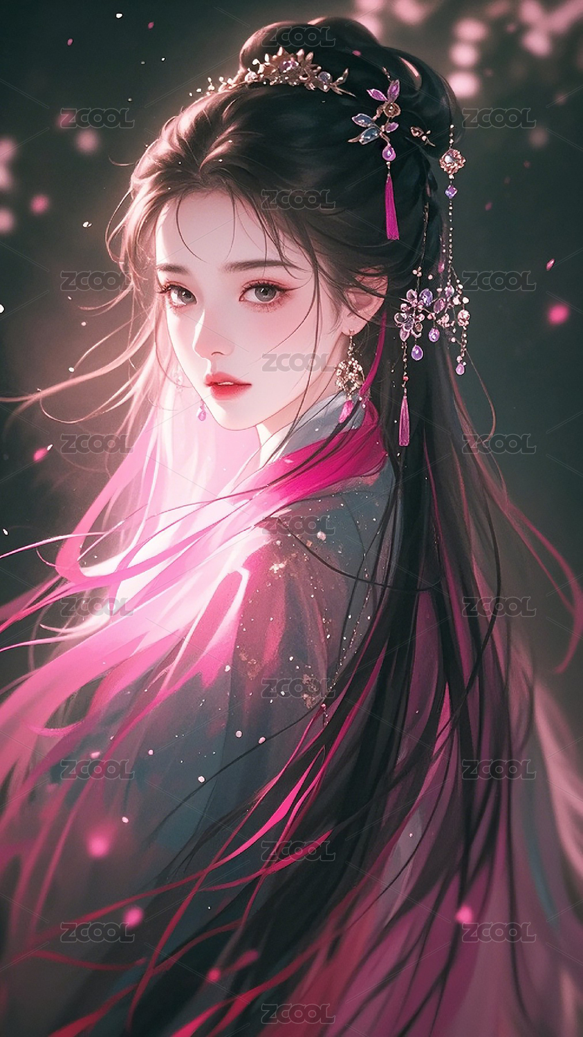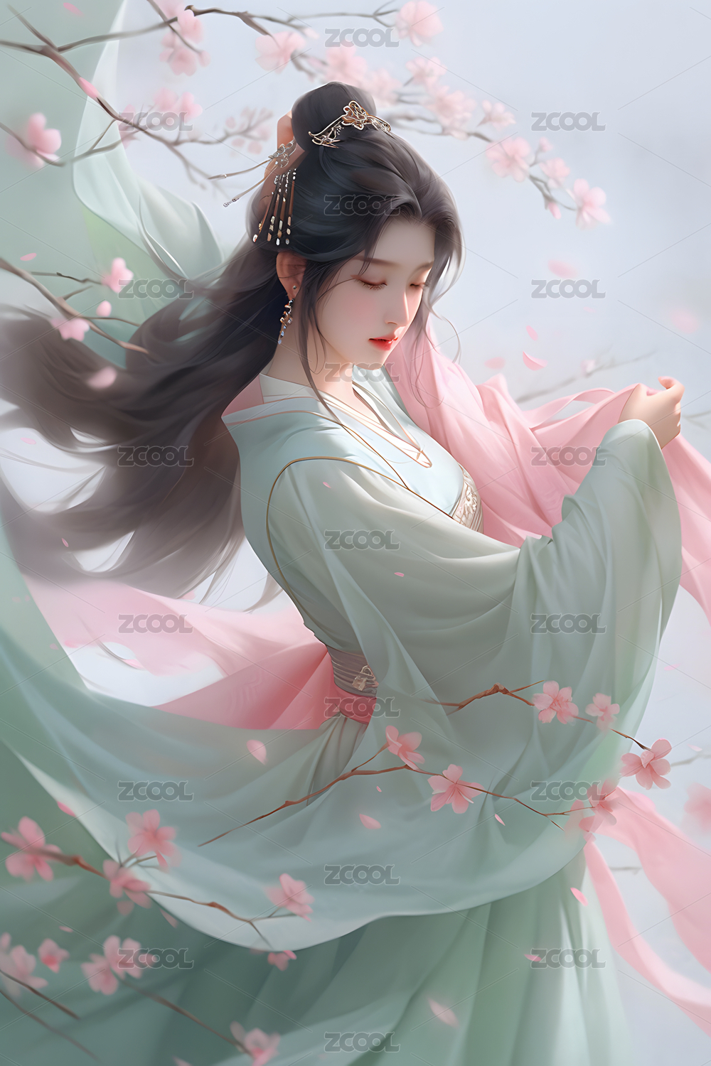 春天,花瓣,艺术,粉色,女子,长发,桃花,发饰,耳饰,古风