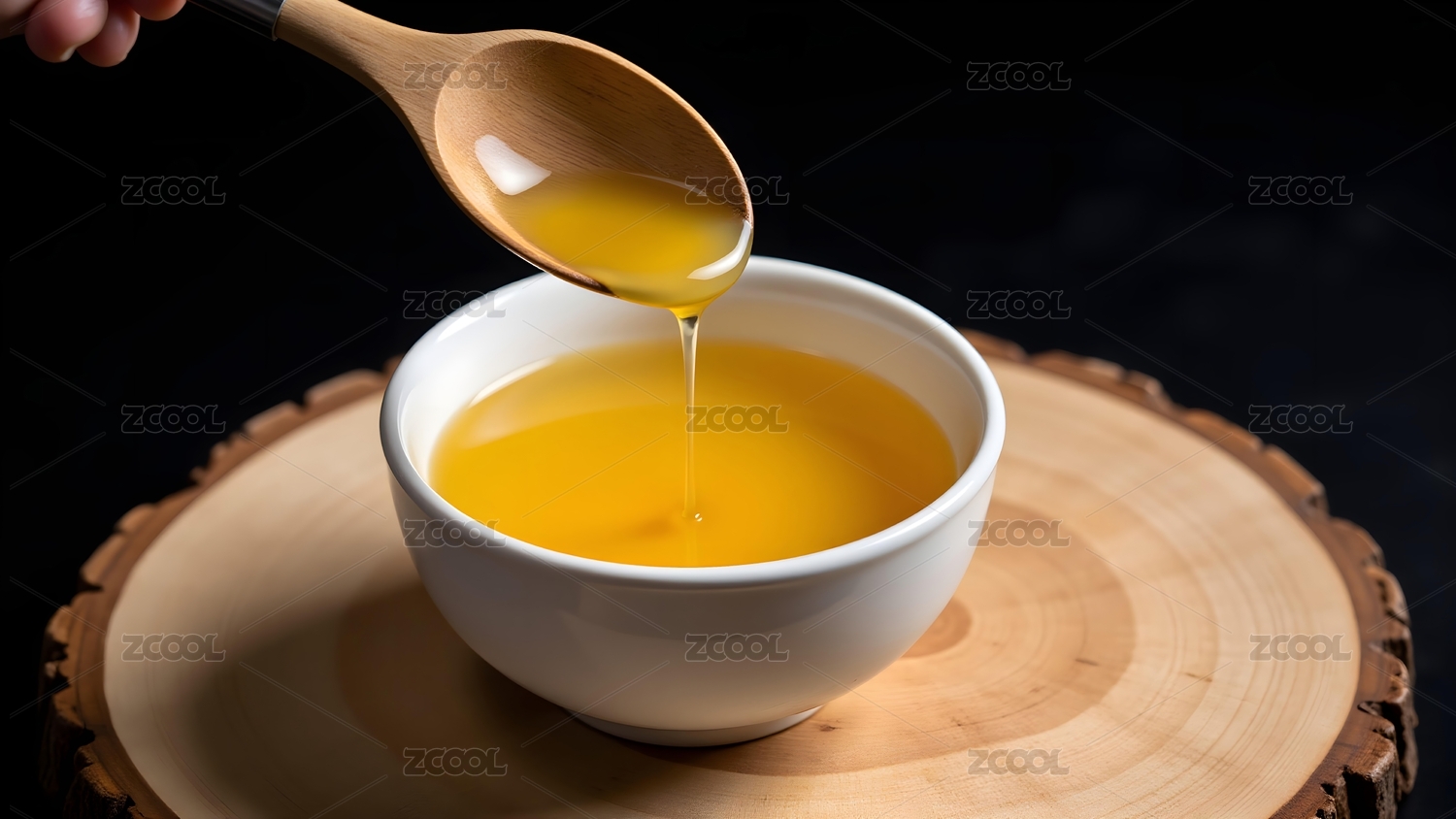 复杂背景中的器皿中盛着的优质亚麻籽油