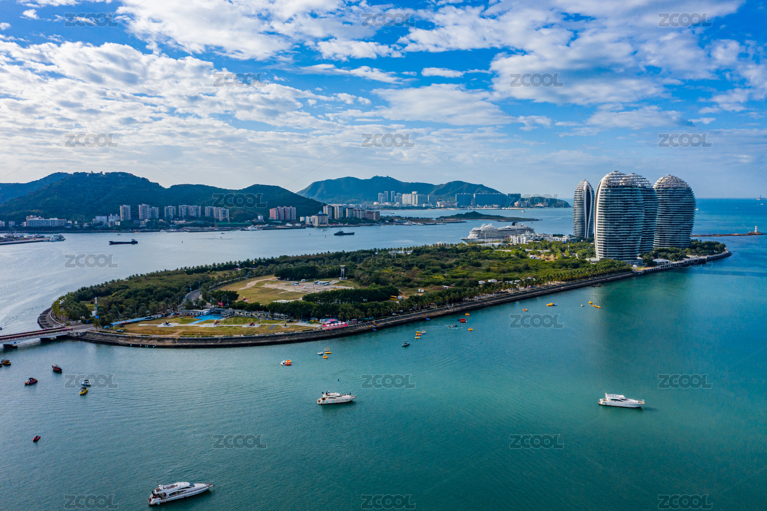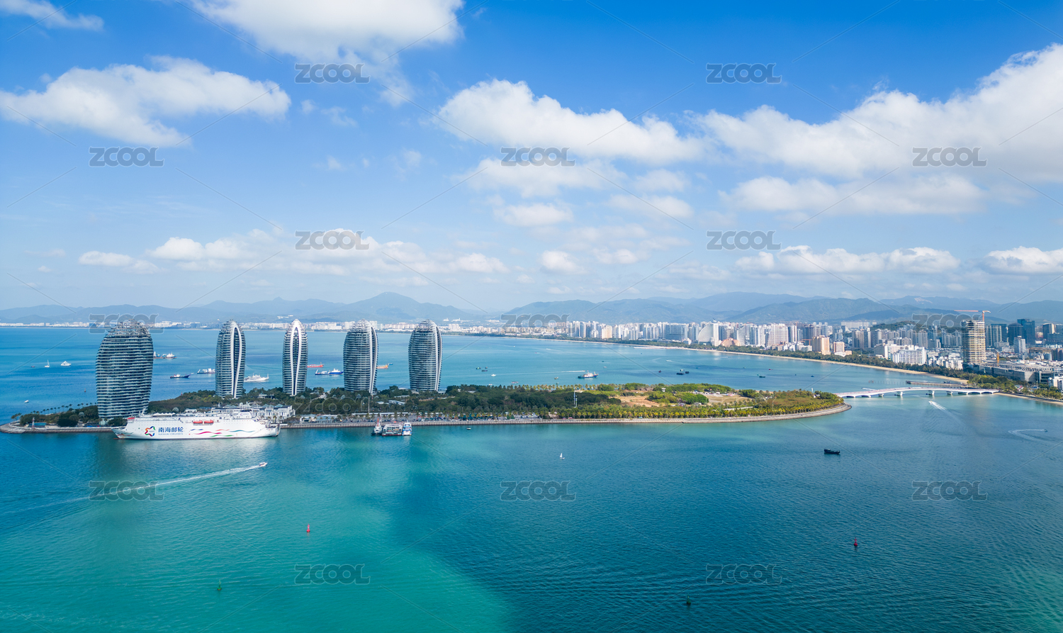Aerial View of Cruise Home Port and Luxury Hotels on Phoenix Island, Landmark Architecture of Sanya City, Hainan Province, China