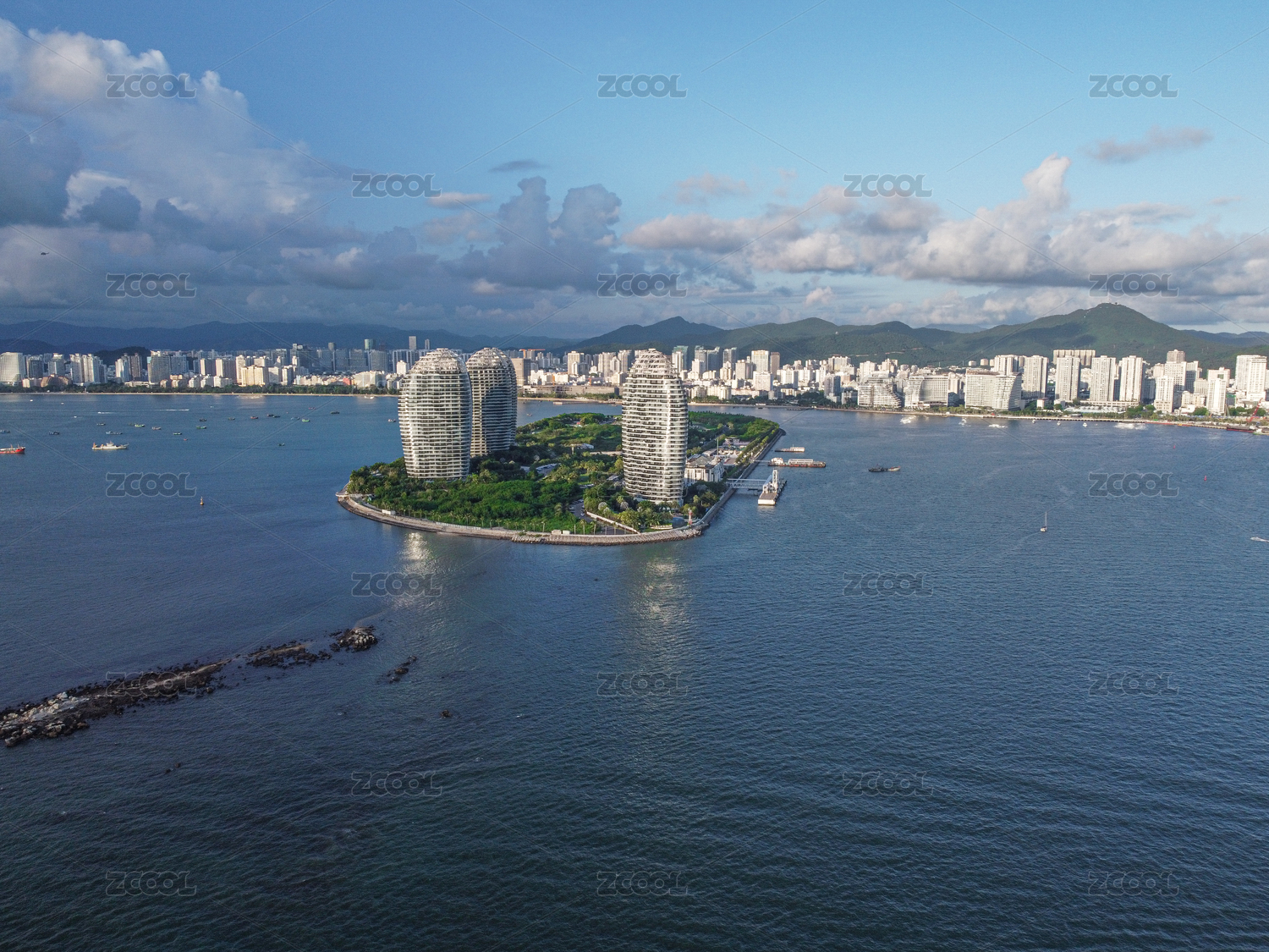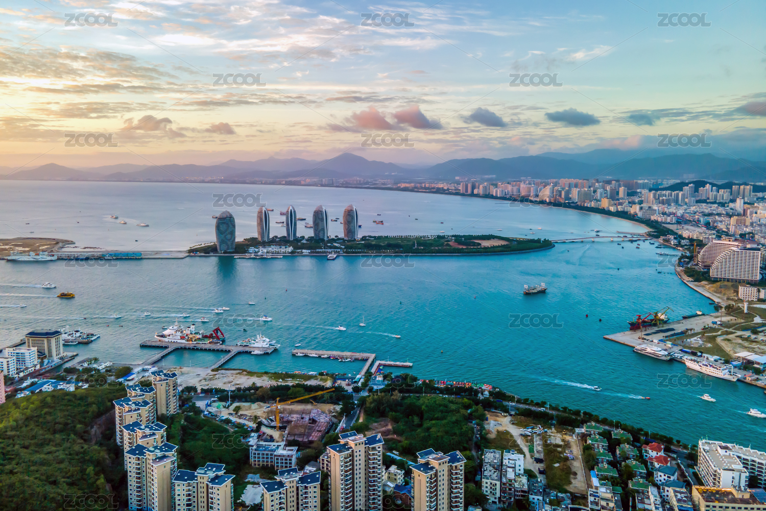 中国海南三亚凤凰岛和城市风光航拍