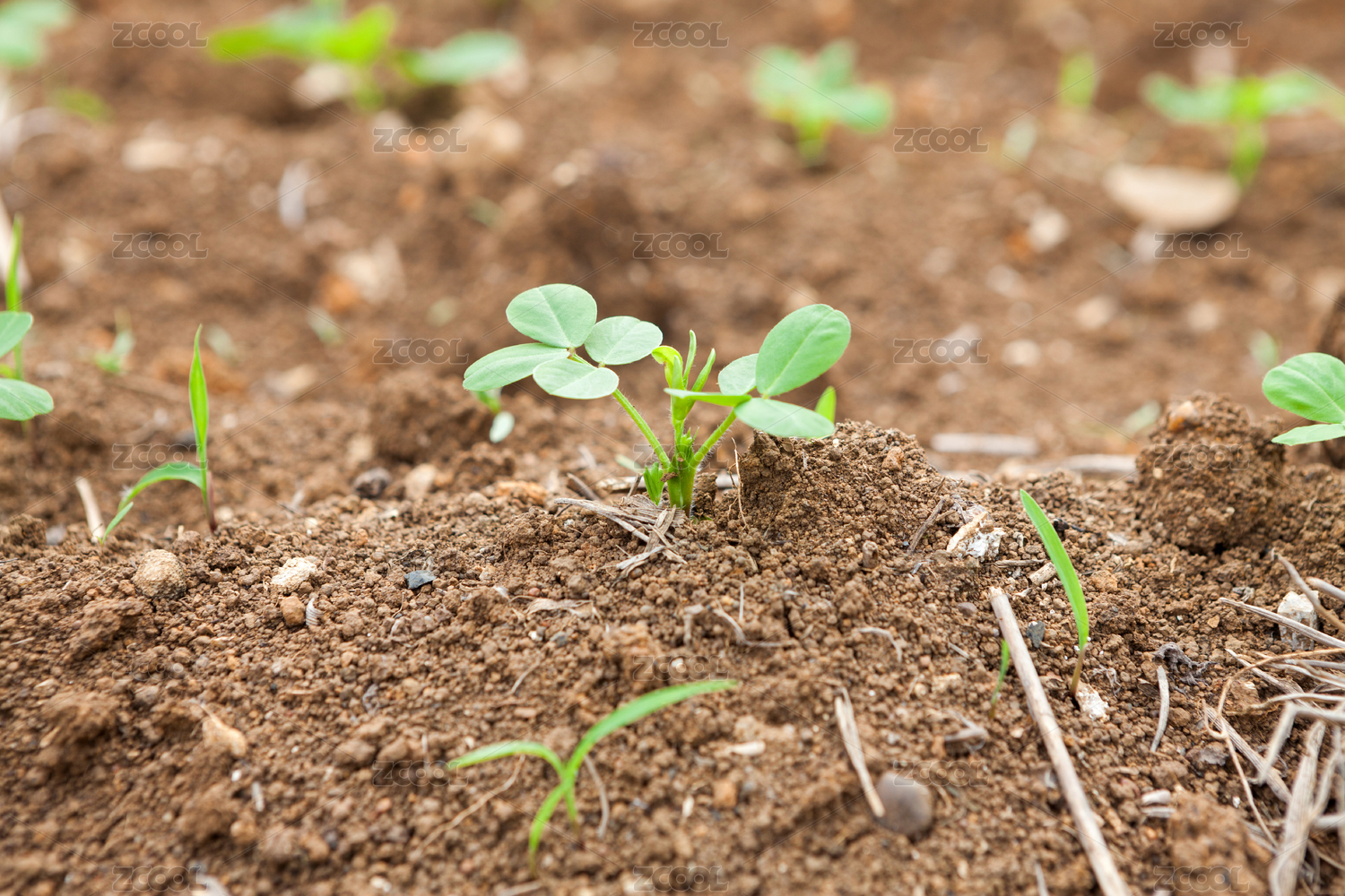 干燥农田土地里生长的绿色植物幼苗