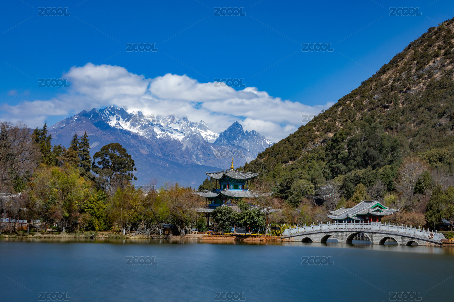 丽江古城黑龙潭公园和玉龙雪山白昼晴天