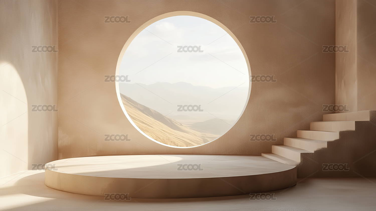 圆形,风景,窗户,阳光,白天,蓝天,白云,山,绿色,米色