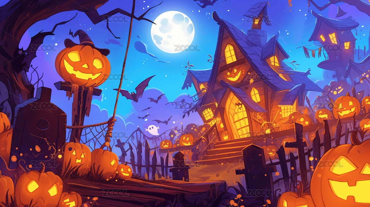 万圣节,节日,南瓜灯,插画,南瓜,鬼魂,背景,夜晚,树木,神秘