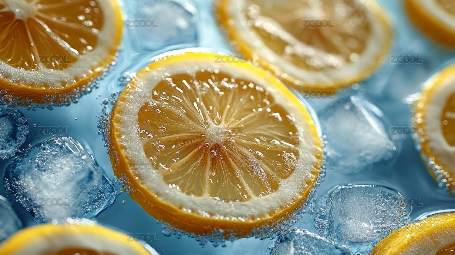 柠檬与冰块蓝色背景