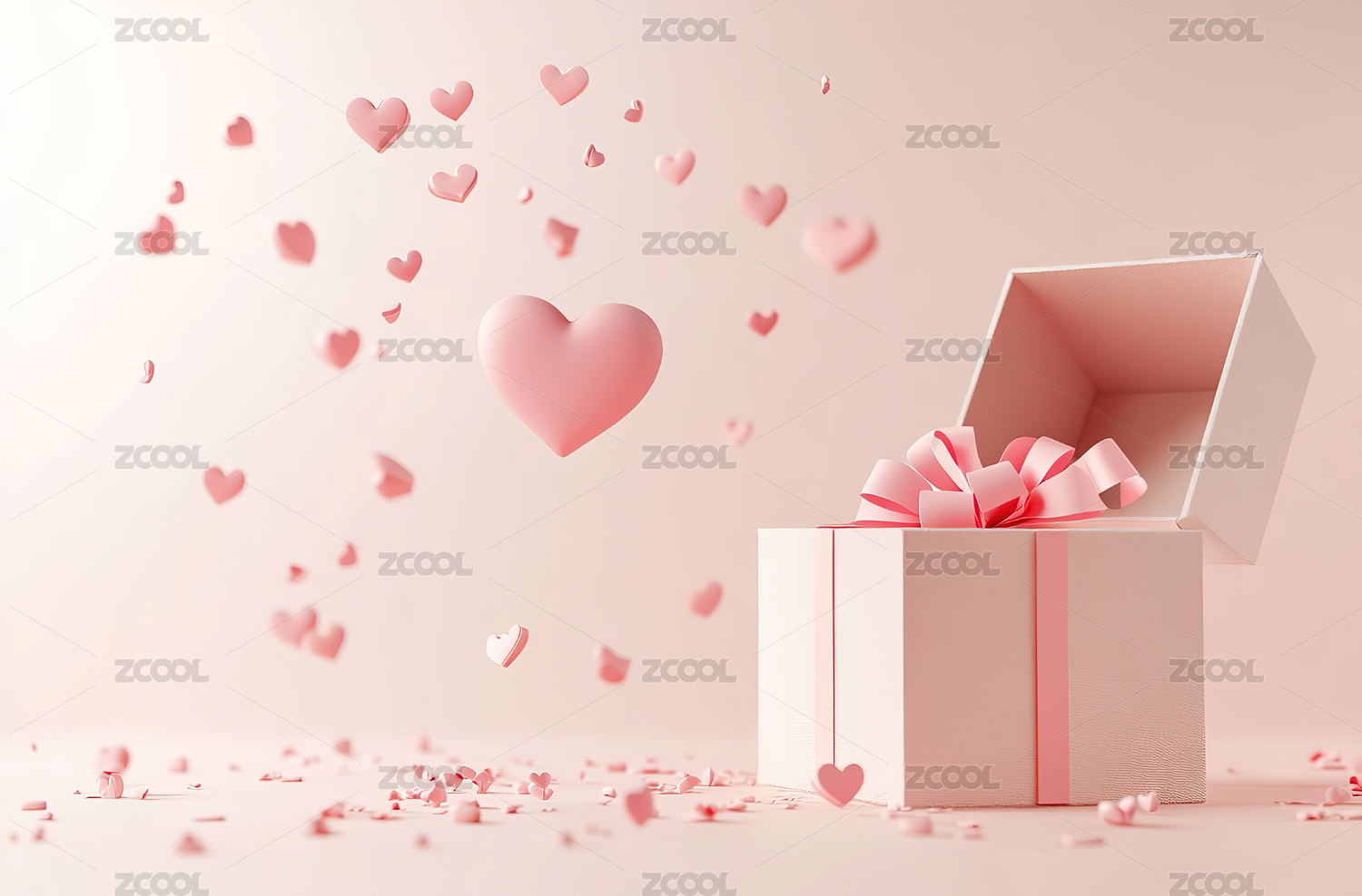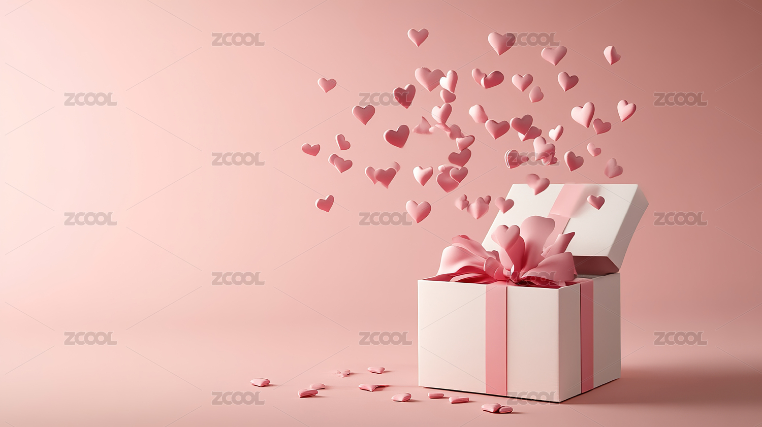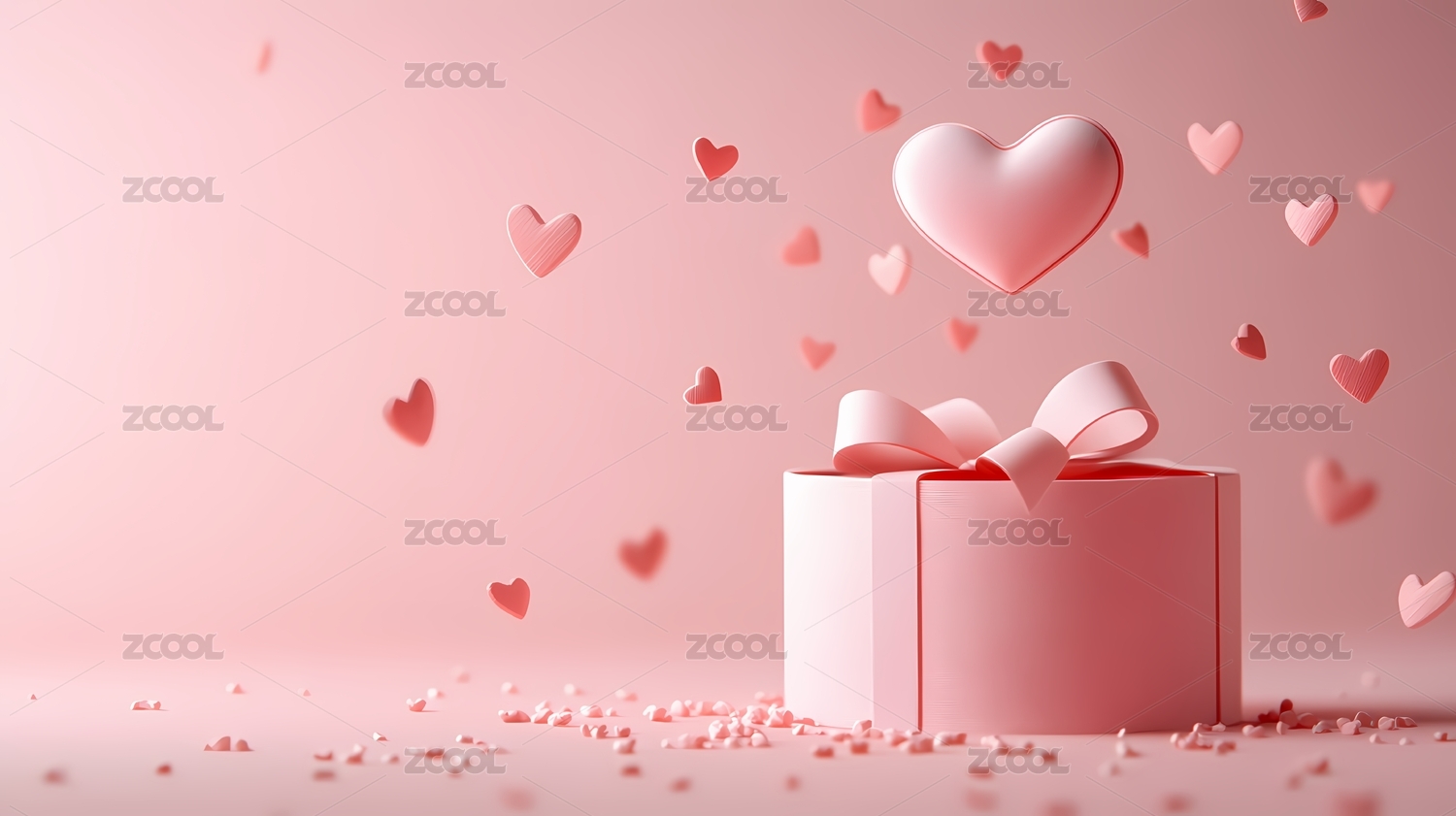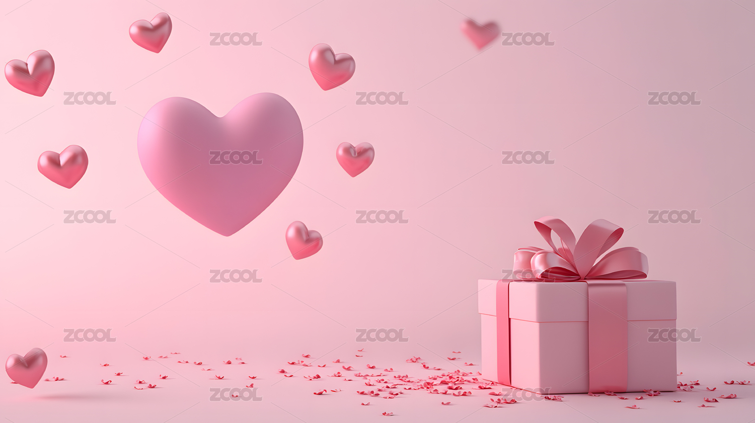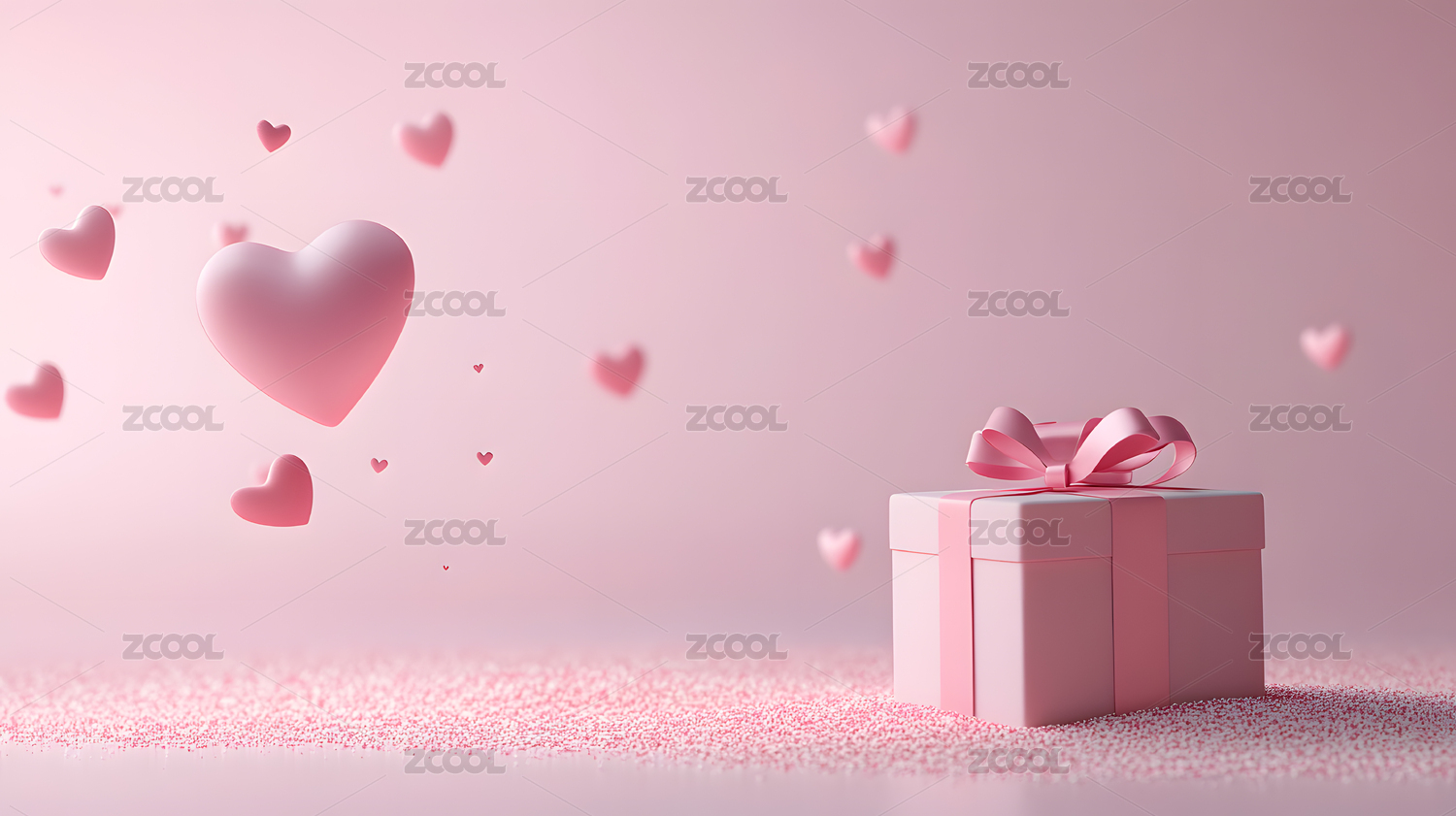 绑着丝带的礼品盒周围漂浮着粉色爱心