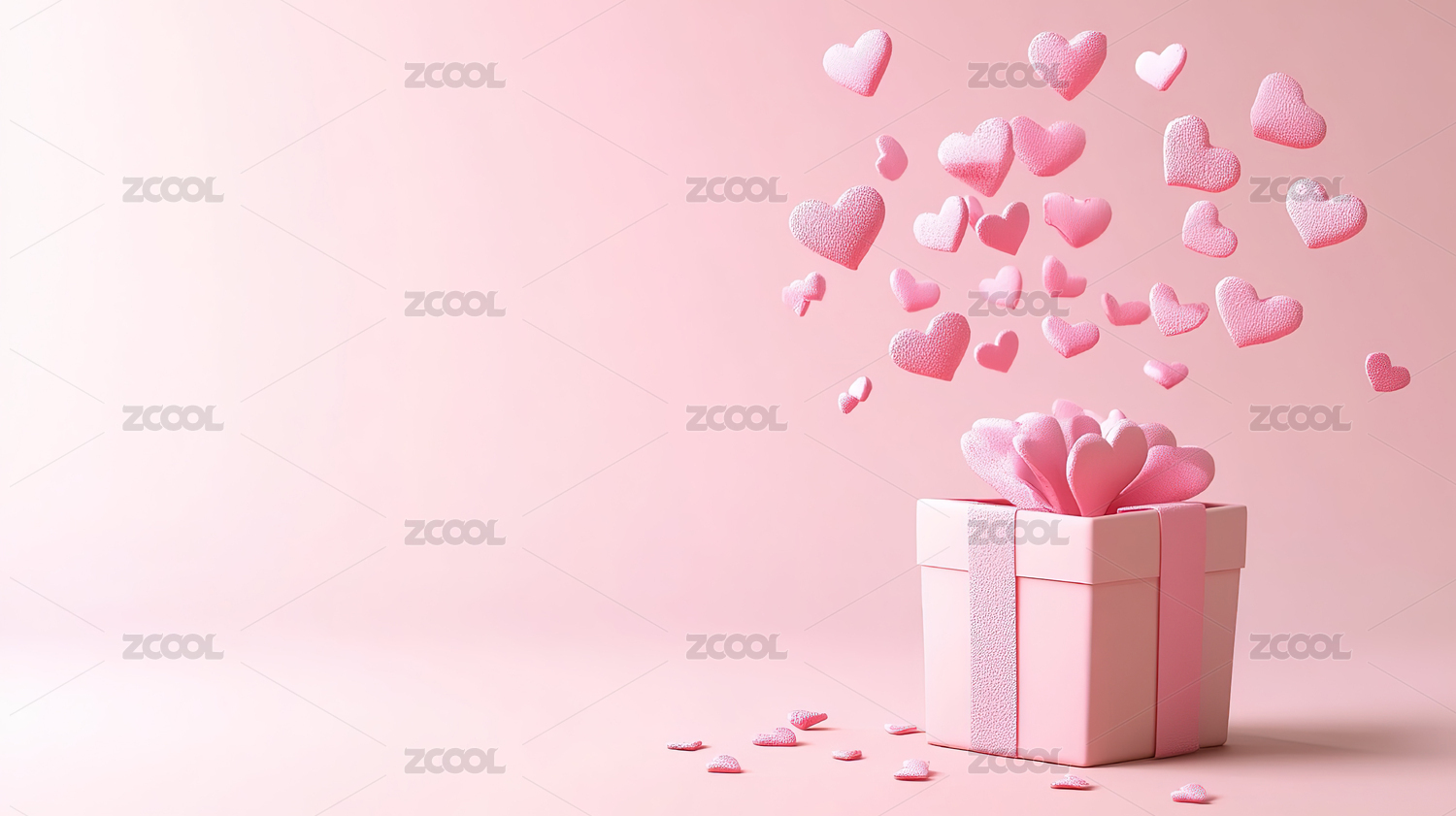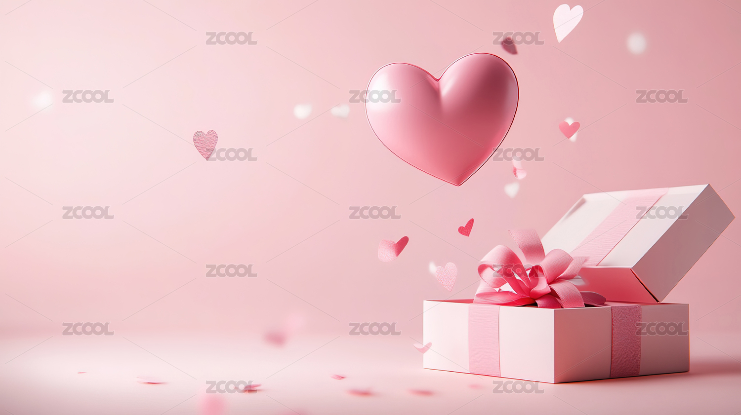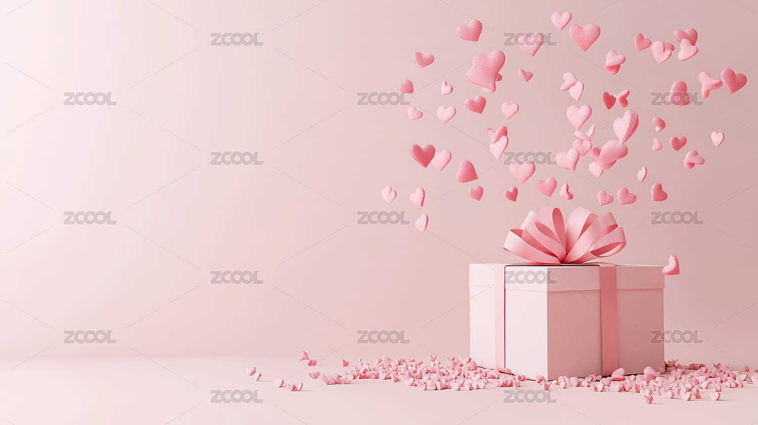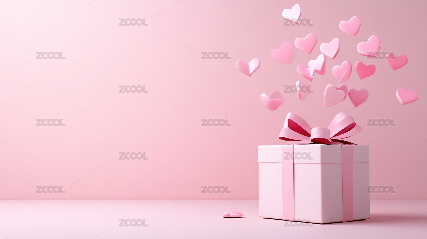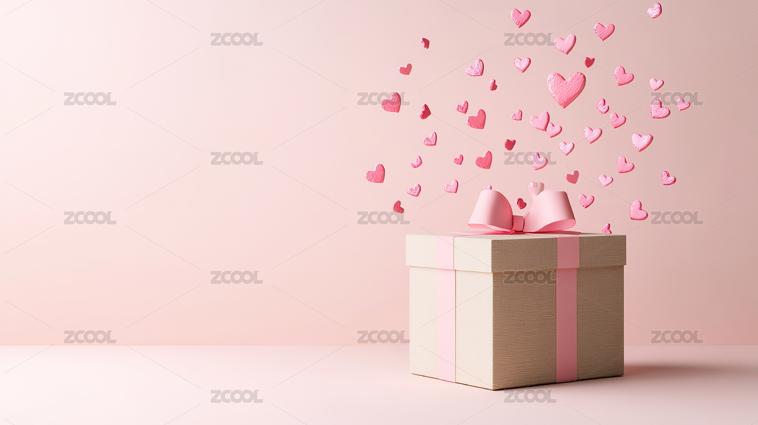 绑着丝带的礼品盒周围漂浮着粉色爱心