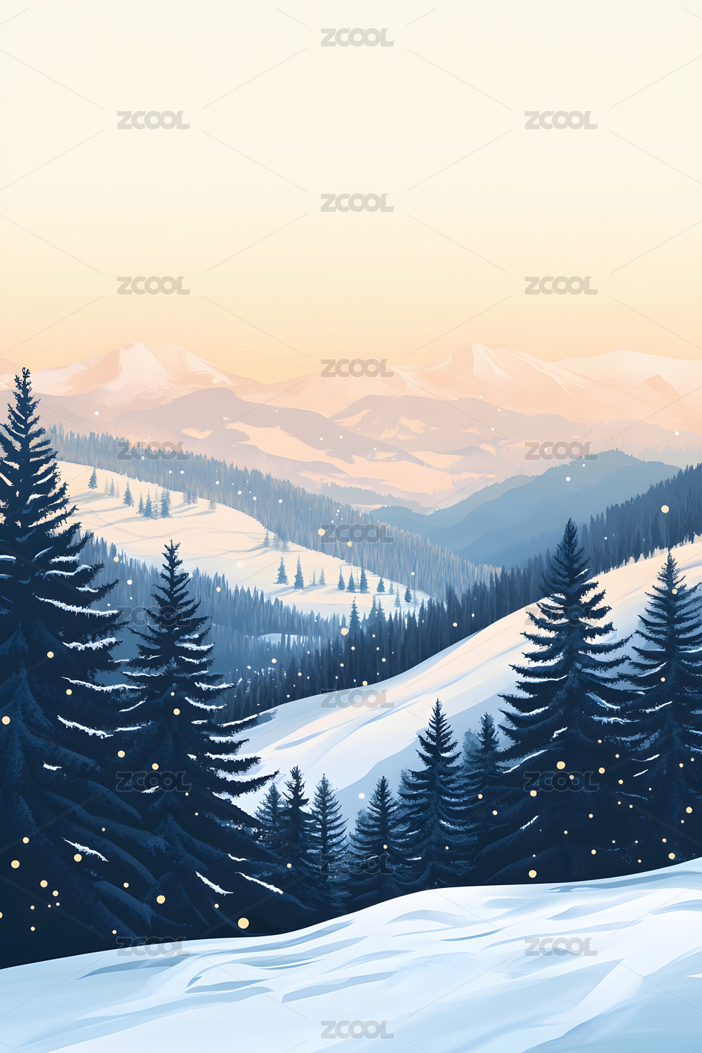 冬天森林雪山下雪唯美插画海报