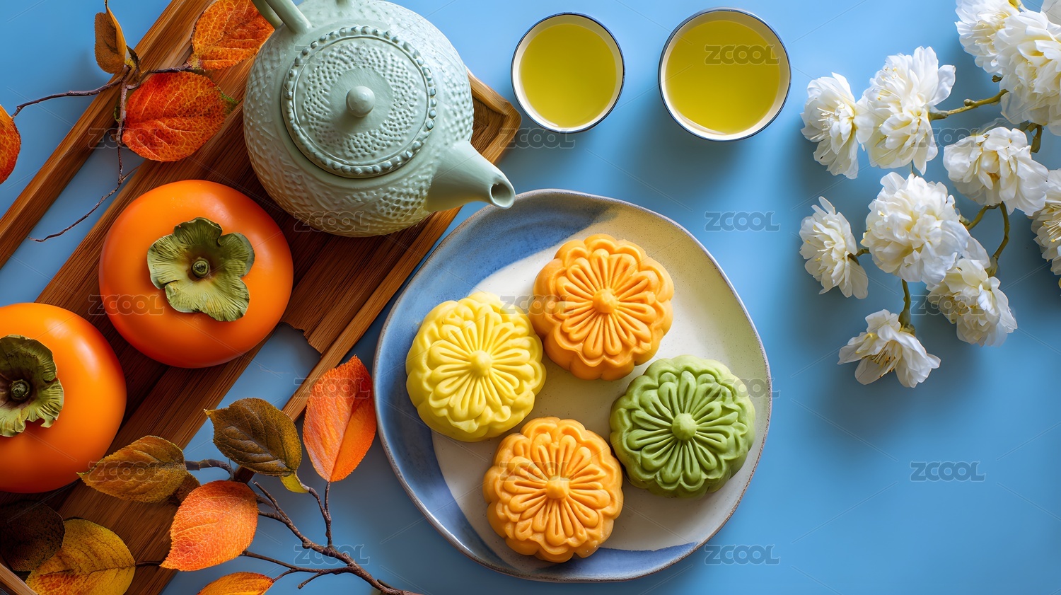 蓝色背景下月饼柿子与茶具的秋季美食摆盘
