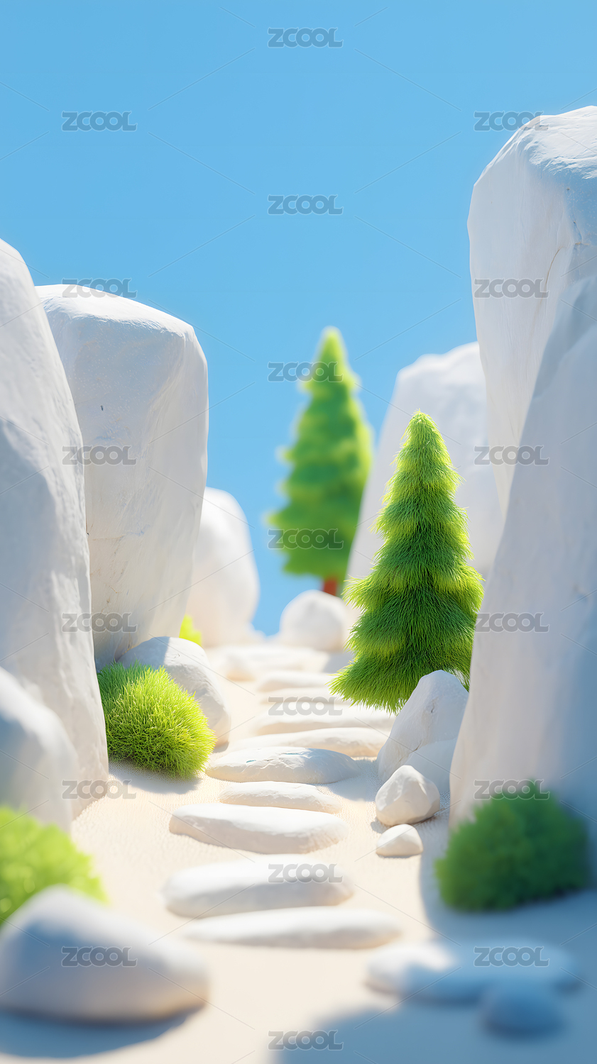 冬天白天白雪皑皑山间台阶小路3D卡通插画