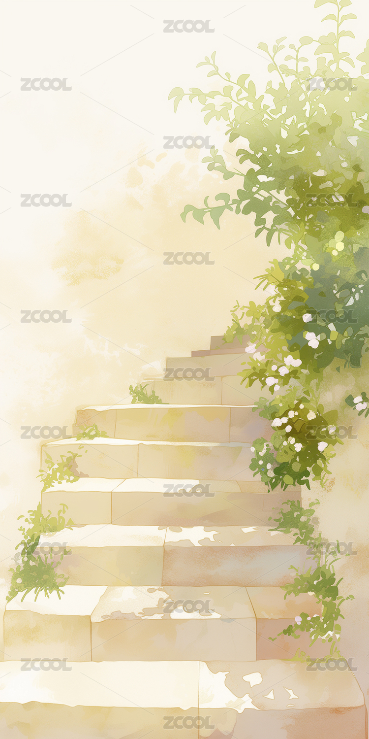白天晴天绿植掩映的台阶阶梯特写插画绘画