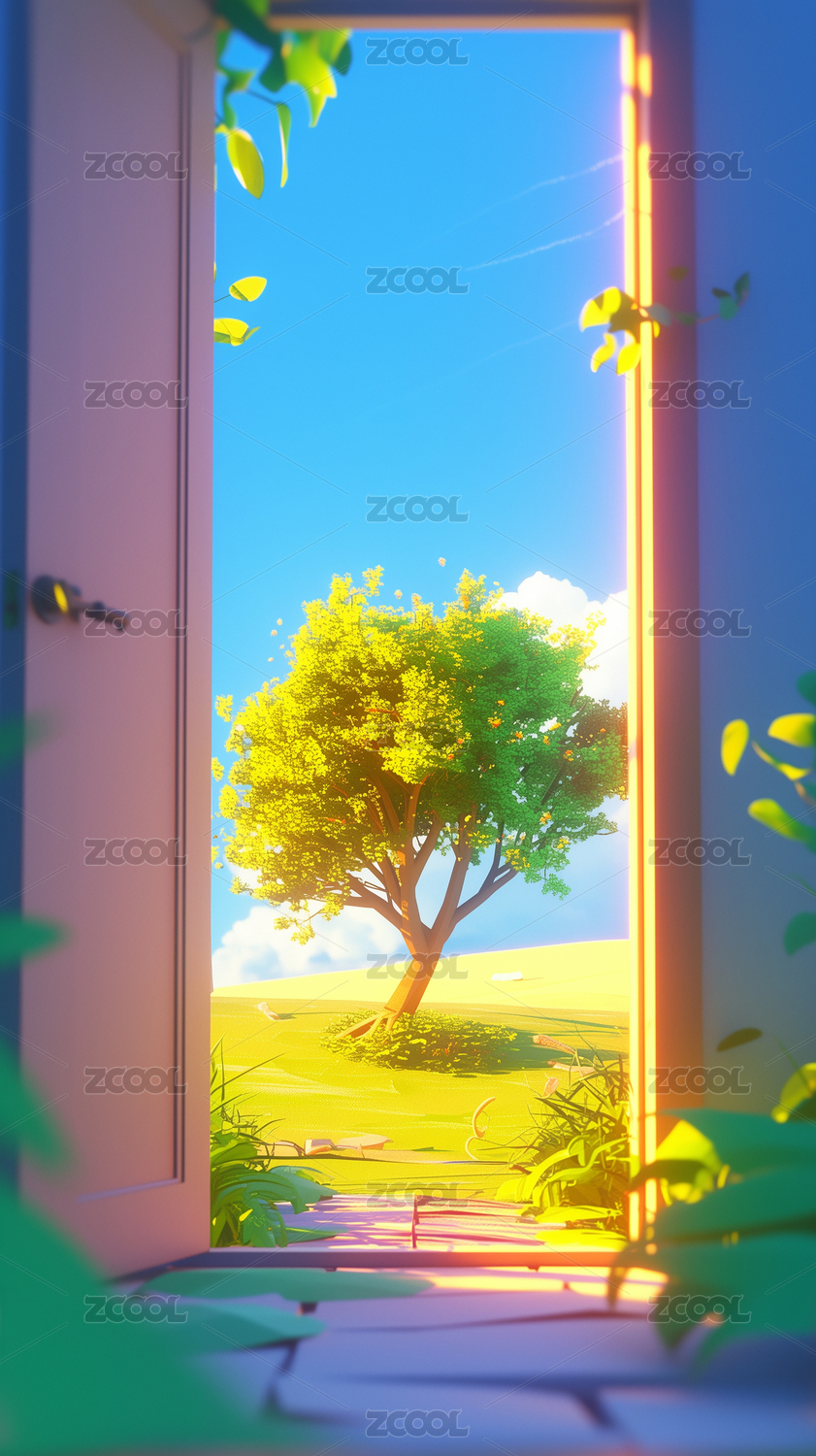 门外白天明亮温暖植物夏天景色3D卡通插画