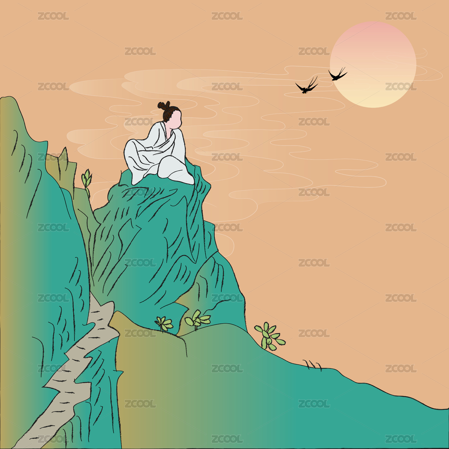 古风重阳老人菊花弹琴古人雅趣工笔矢量插画