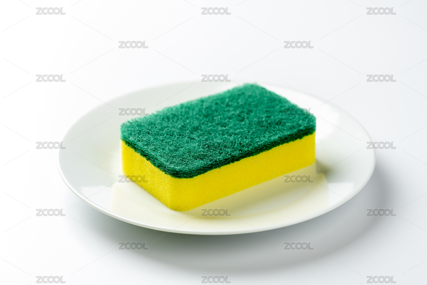 清洁工具百洁布橡胶手套盘子特写白色背景