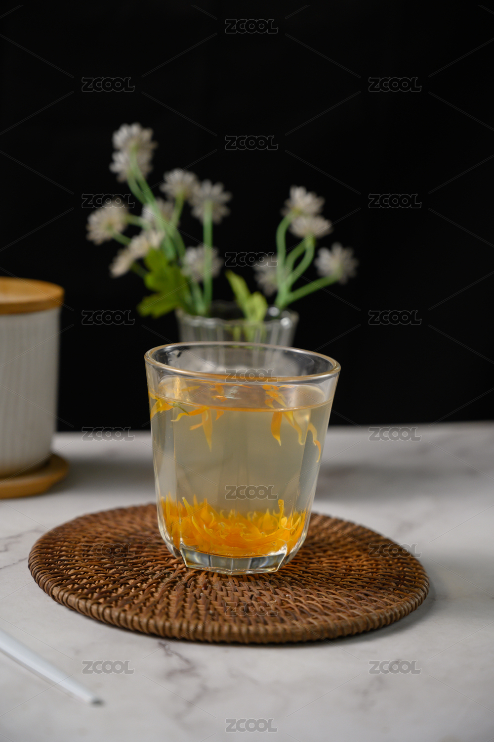 桌面上的杯子里的甘甜可口的金盏菊花茶