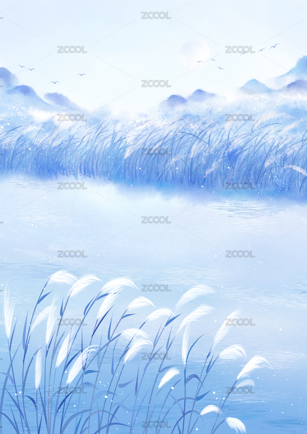 芦苇丛后湖水上泛舟的人节气插画寒露横版
