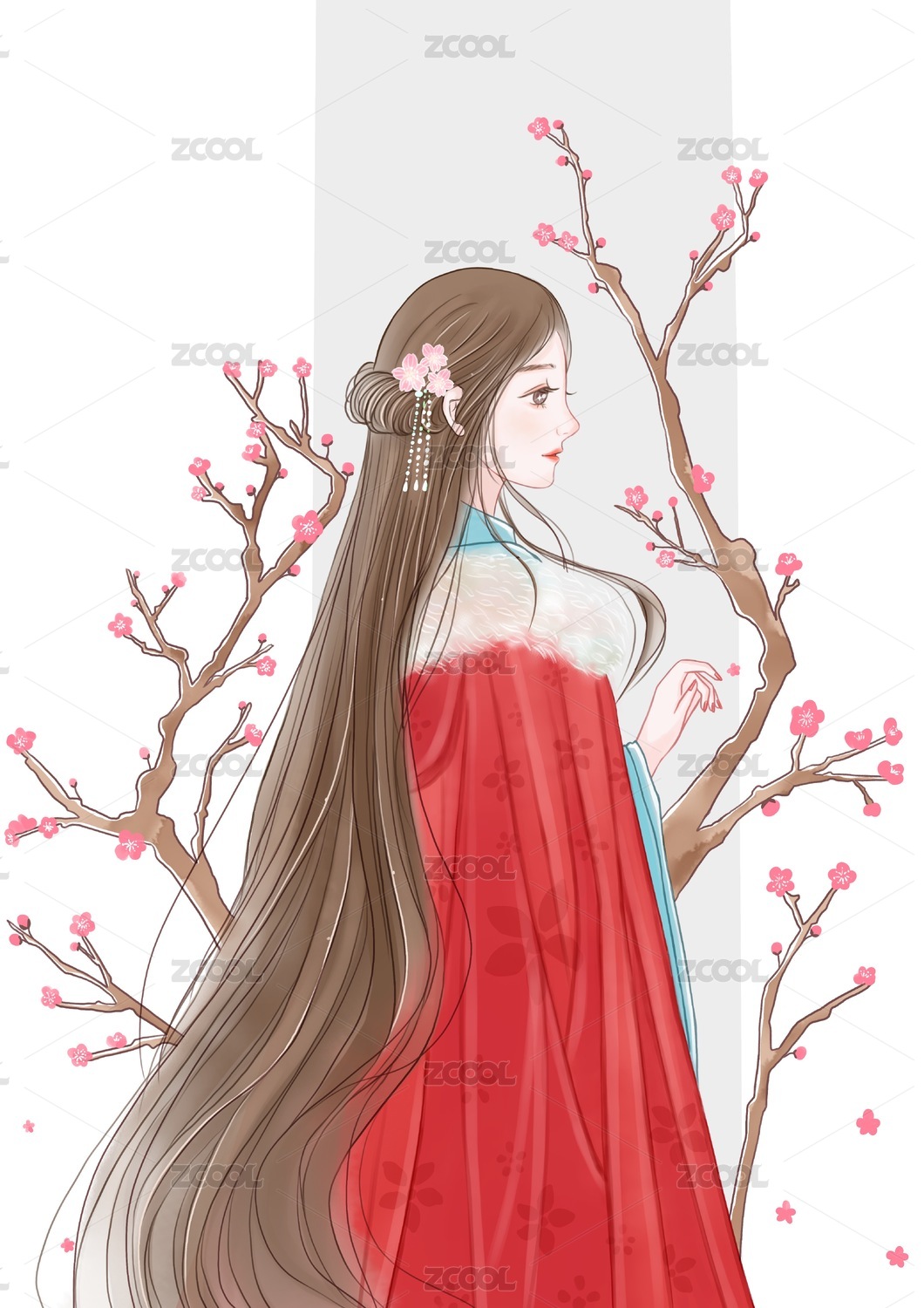 HEKMDTK202211,插画,花,杏花,仕女,女人,美人,少女,女孩,汉服