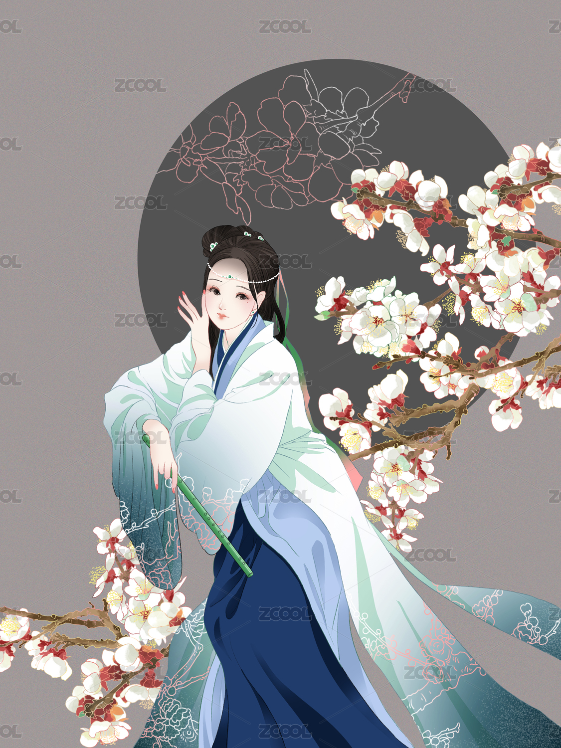 簪花仕女图之汉服拿着笛子的少女