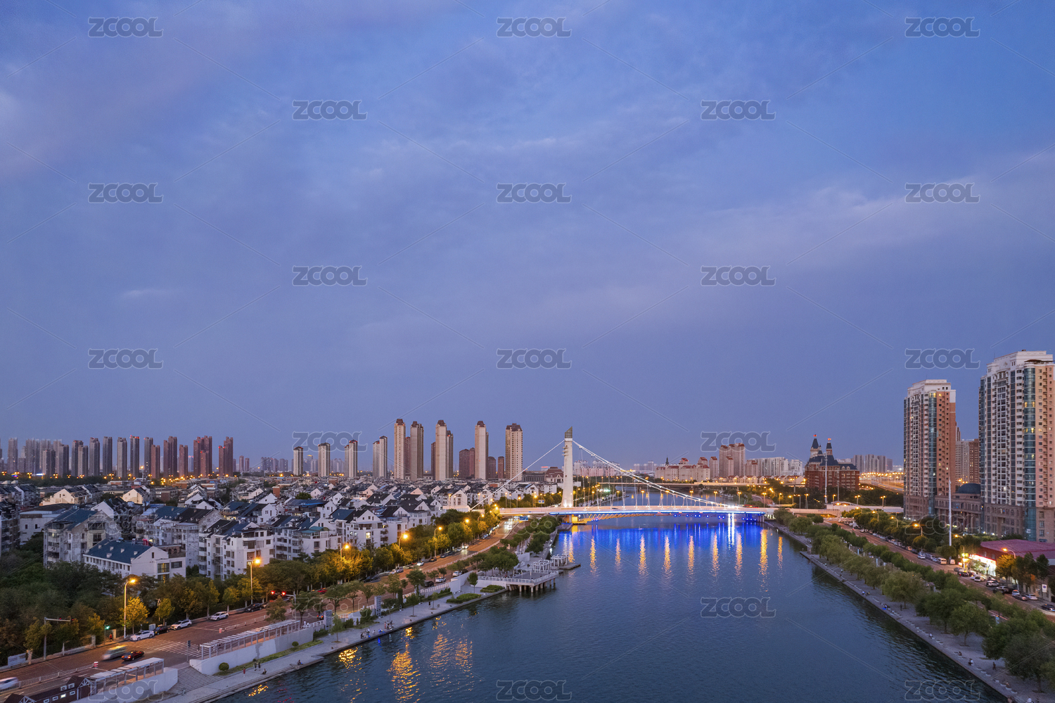 日落天津富民桥海河沿岸城市建筑夜景航拍