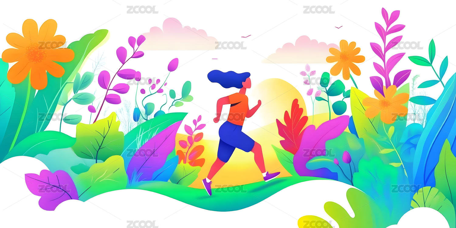 人物在花丛中跑步运动渐变插画