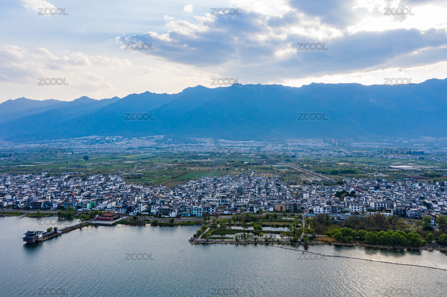 中国云南大理城市洱海航拍、风车山、鹿卧山遗址