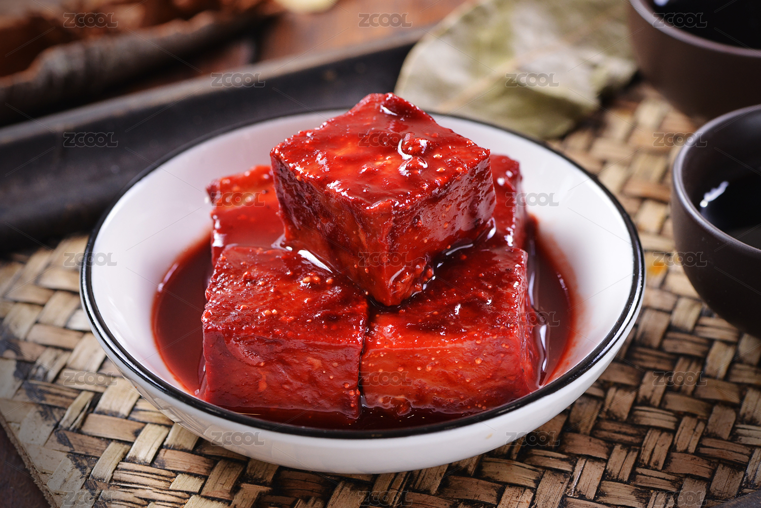 木质背景上陶瓷餐具里摆放的豆腐乳