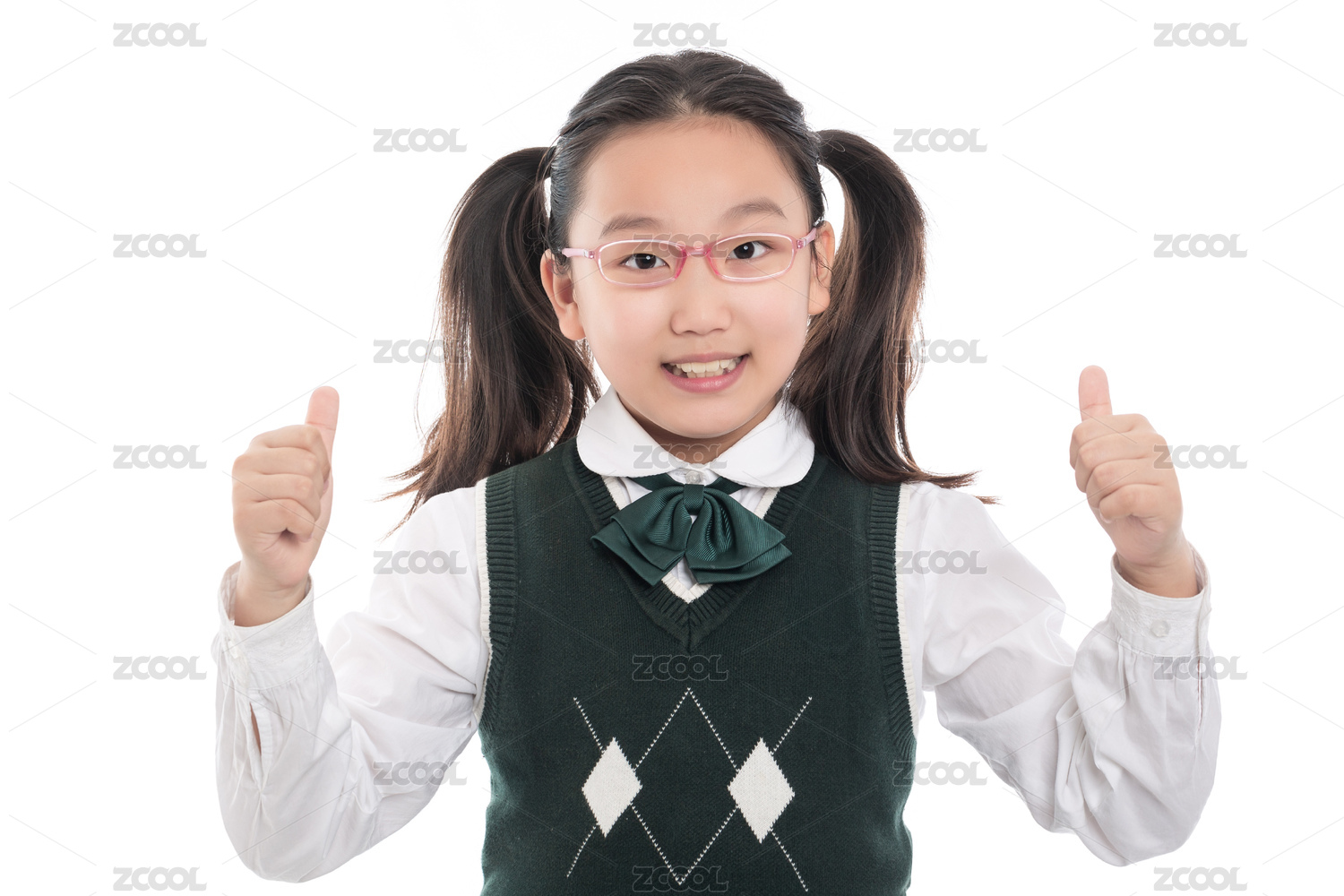 白色背景前穿校服背蓝色书包伸着大拇指的小女生