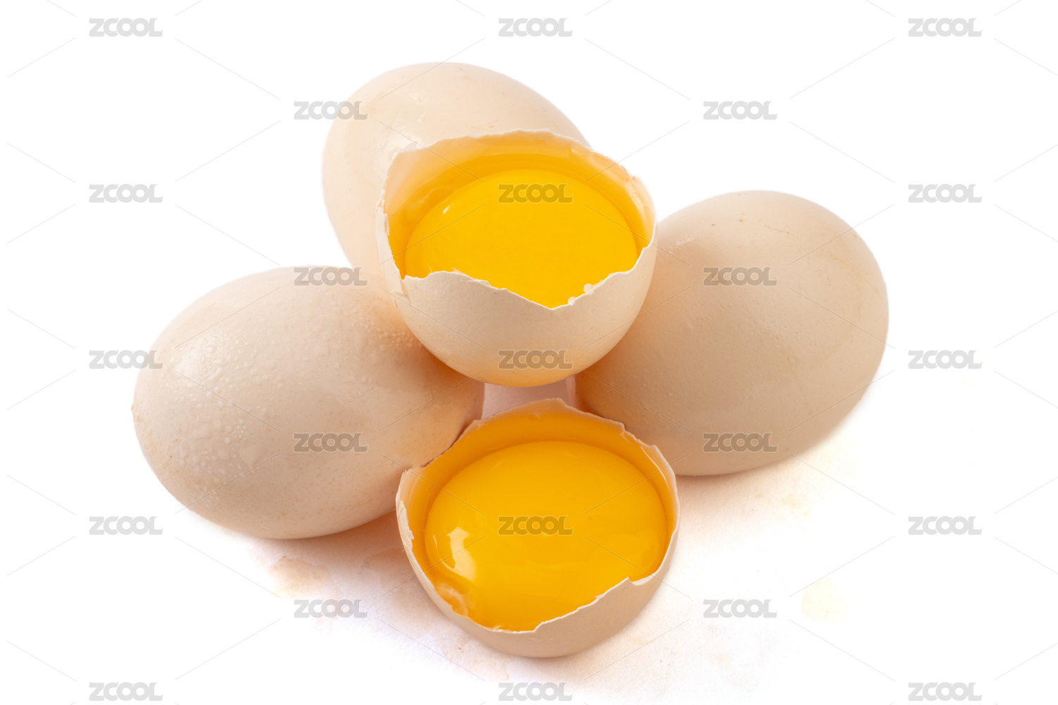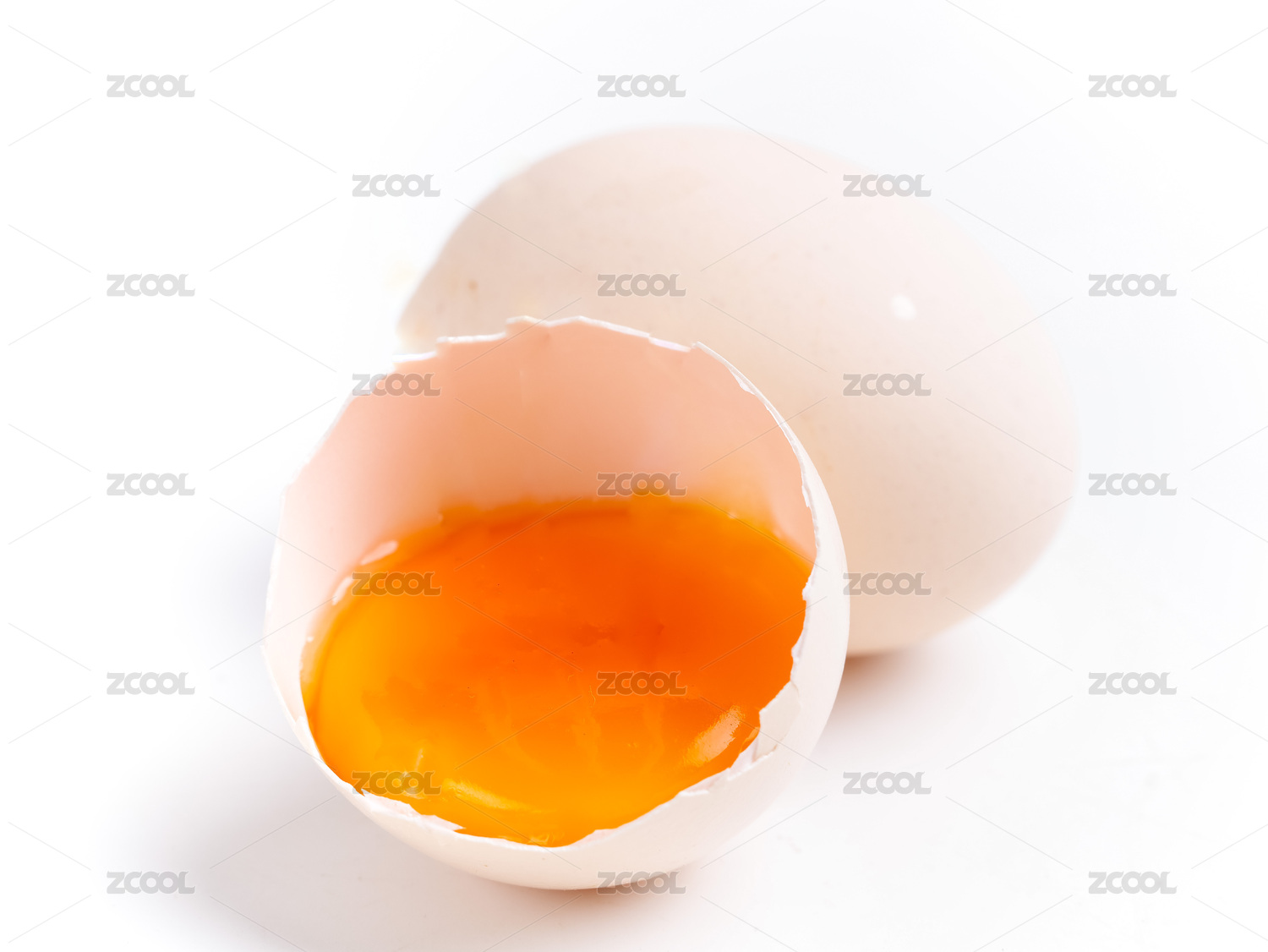 摆放在白色背景前,打开的鸡蛋蛋黄