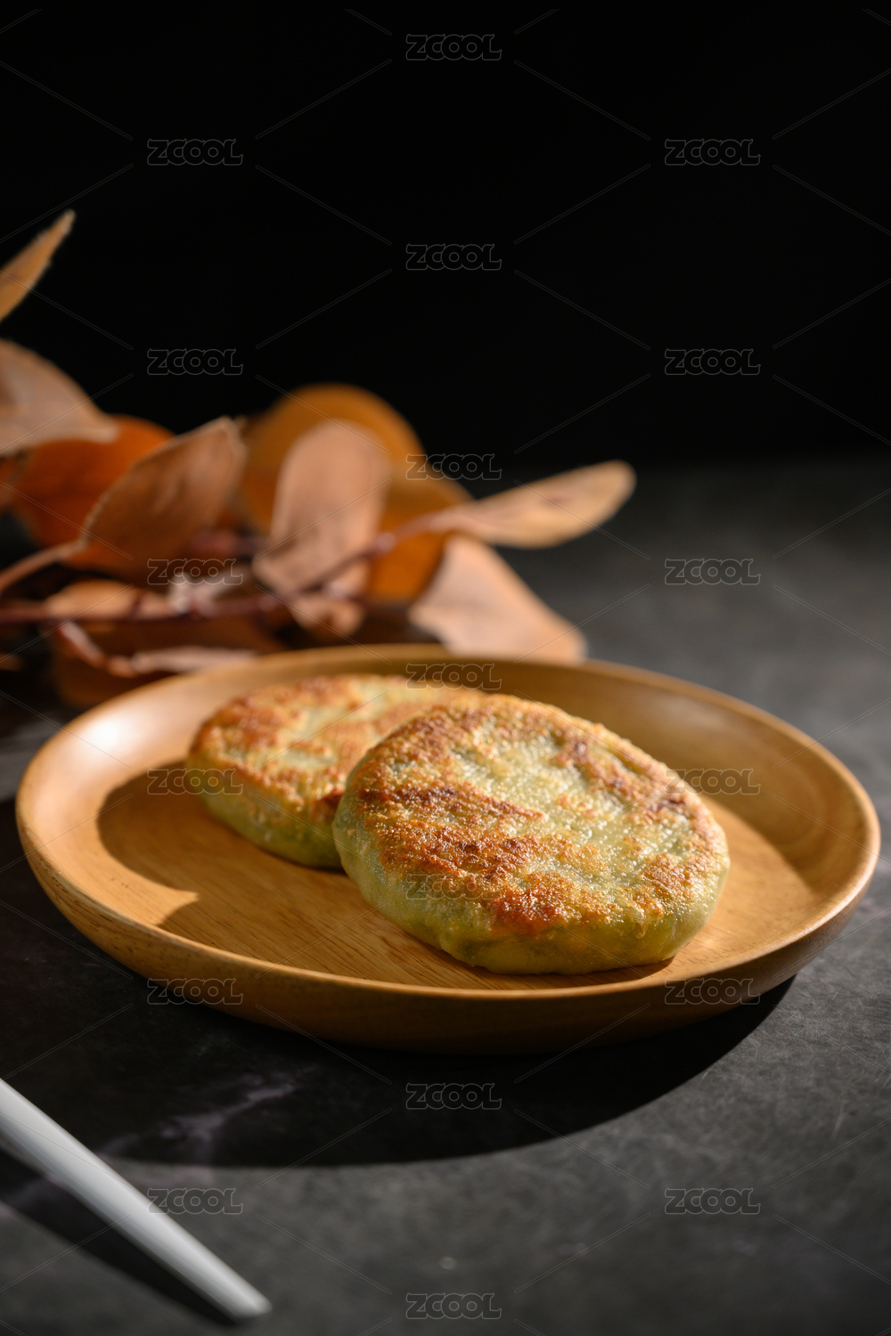 桌面上的盘子里的美味可口的韭菜馅饼