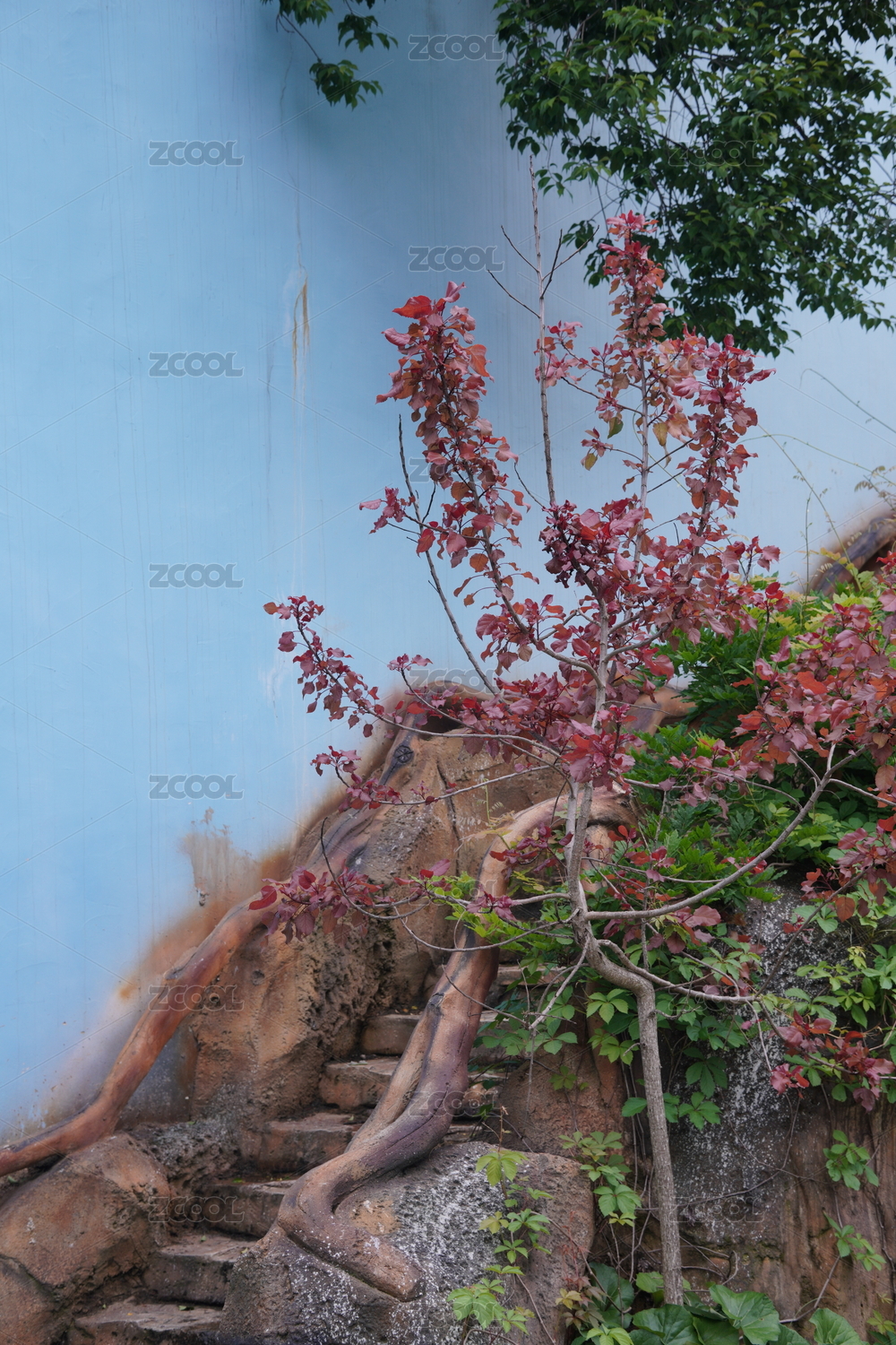 蓝墙旁岩石上长有红叶的植物