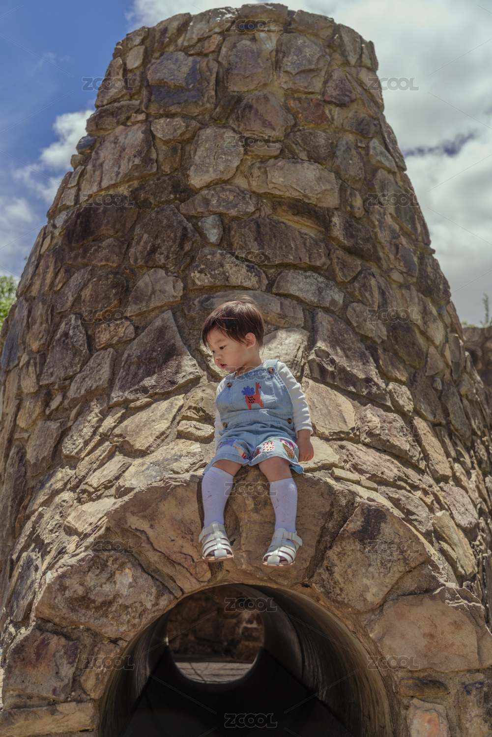 石头隧道游玩的小孩