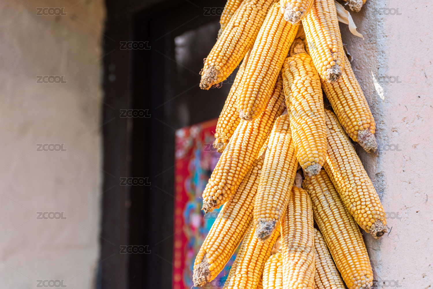 乡村民居大门边悬挂的玉米