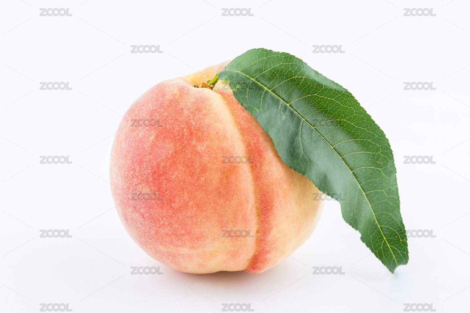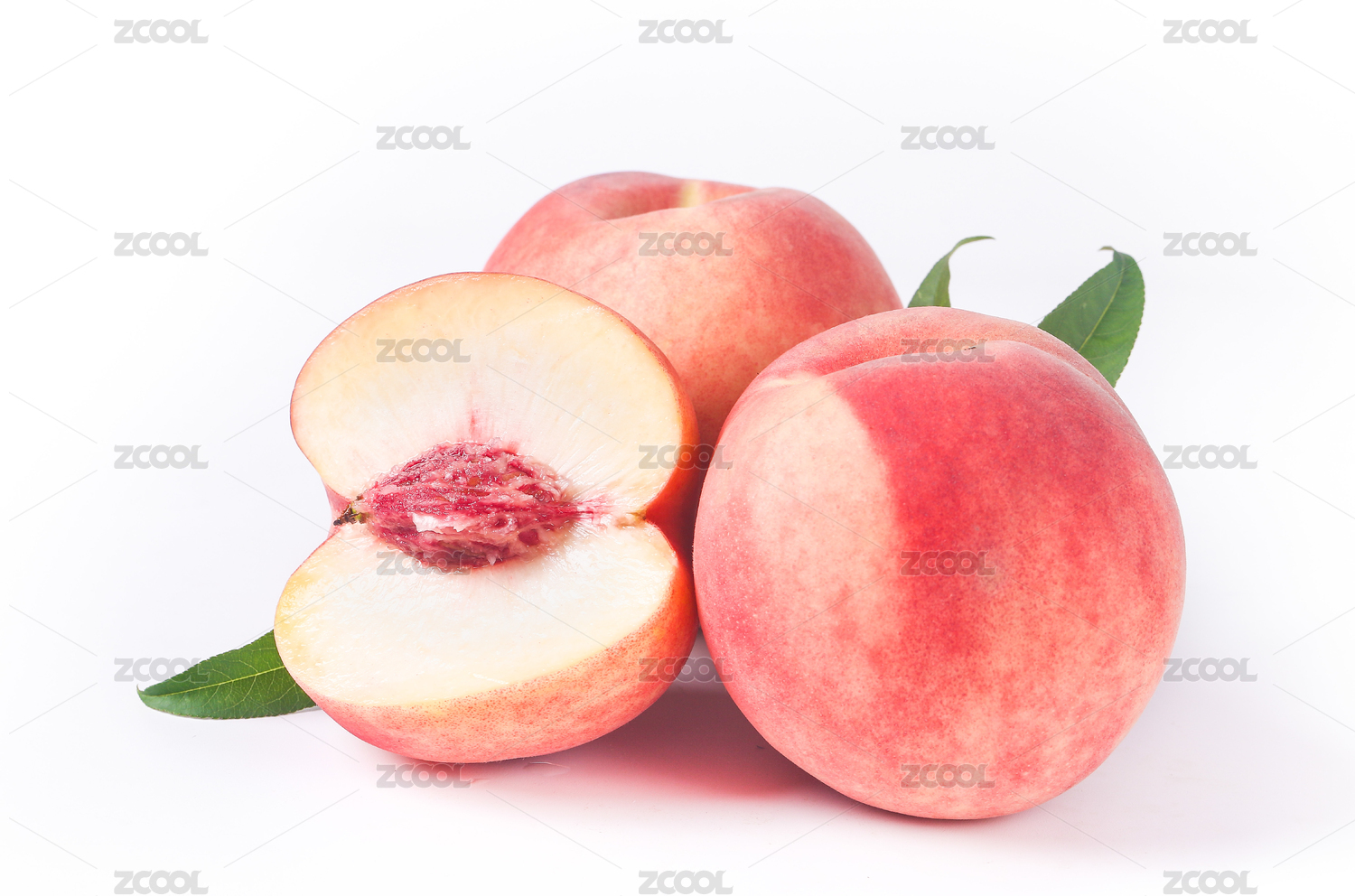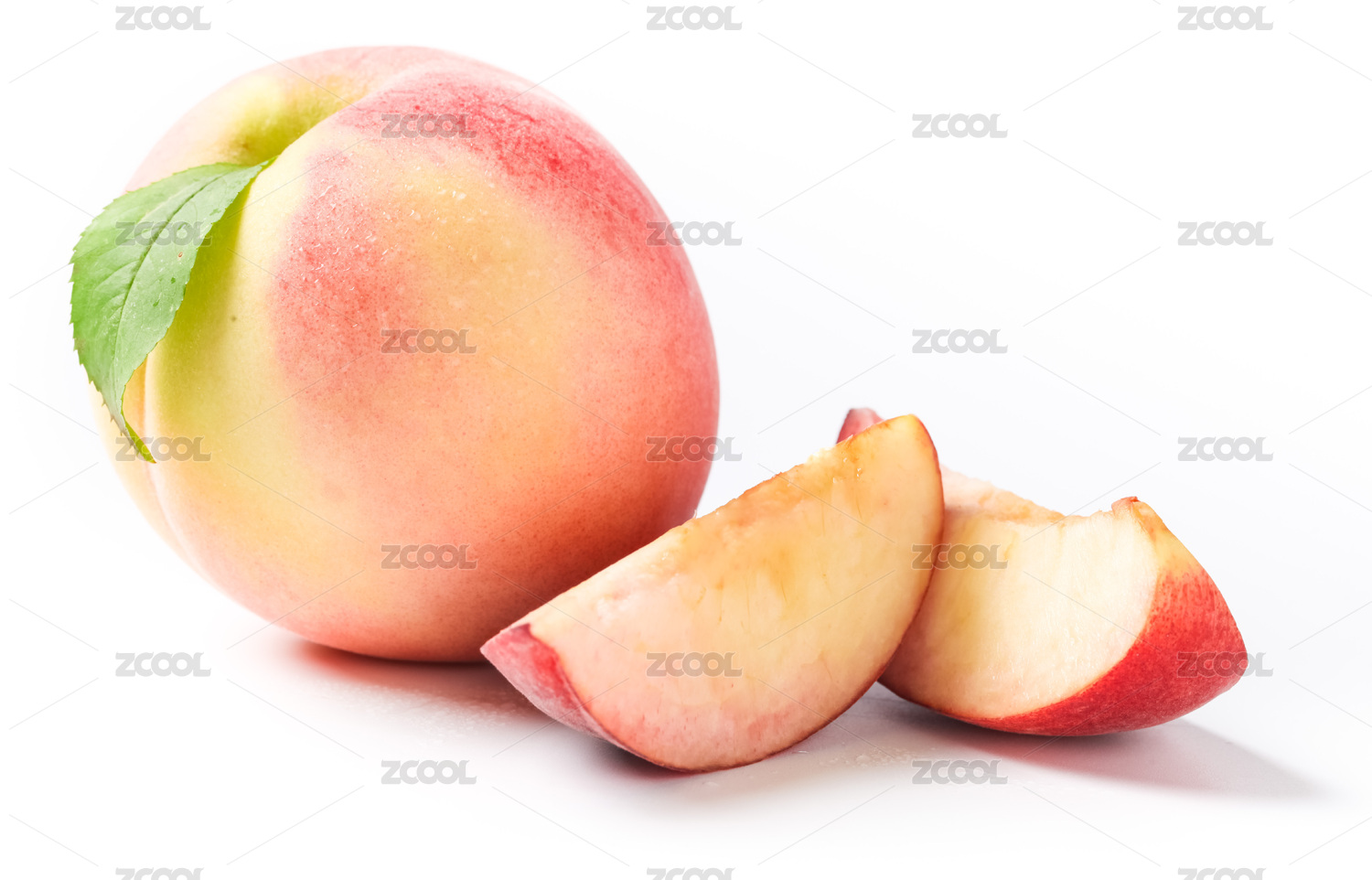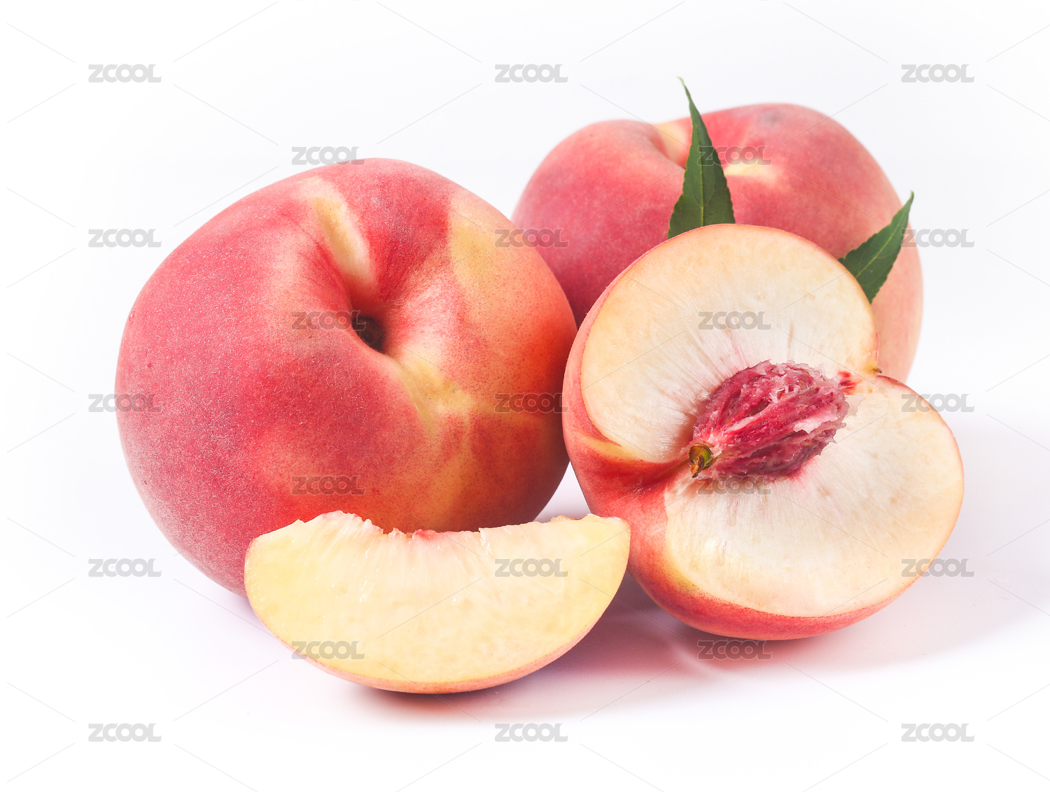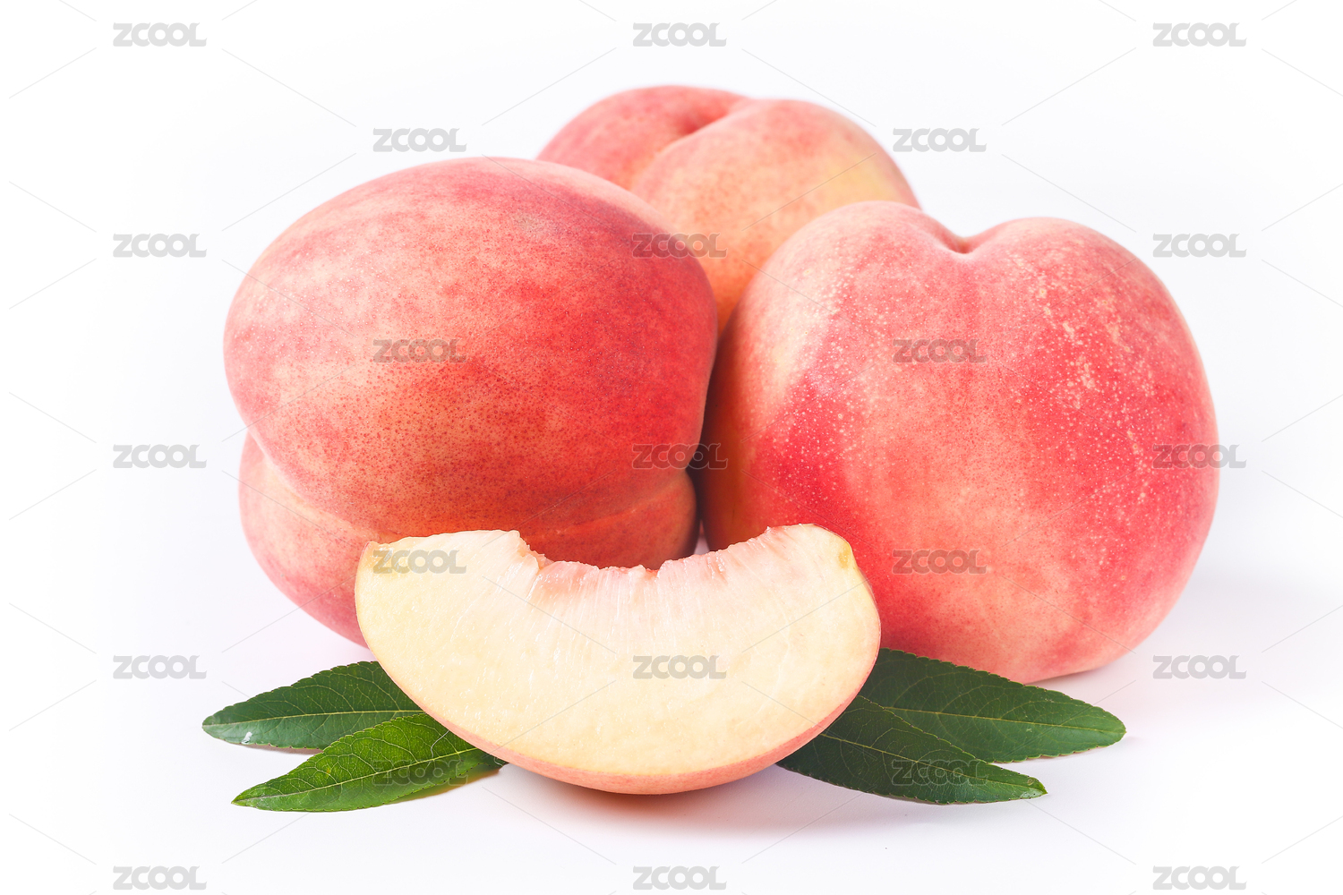 白底上放着新鲜水蜜桃和水蜜桃果肉