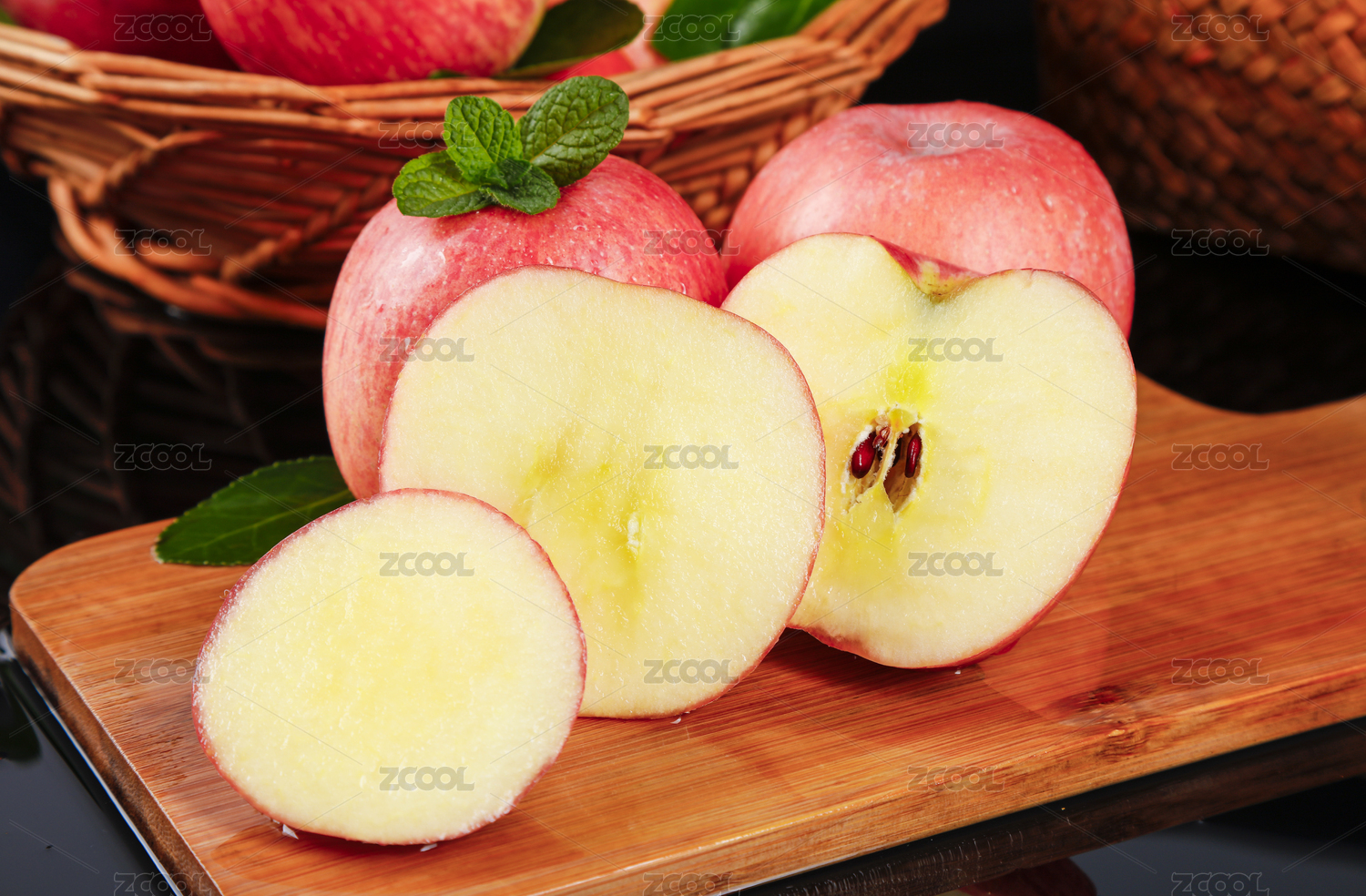 木垫子上放着新鲜红富士苹果和红富士果肉