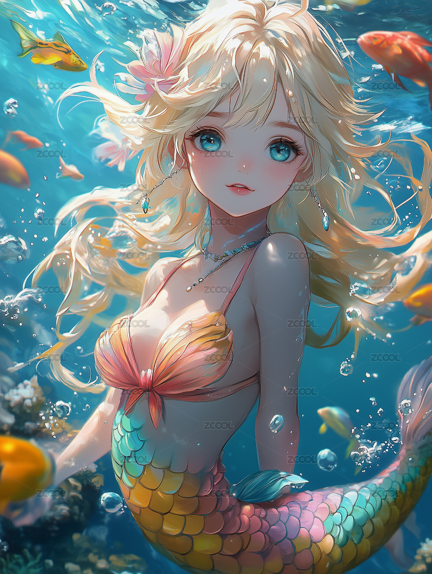 美人鱼,IP形象,海底,贝壳,3D立体,气泡,插画,AIGC,AI绘画,盲盒