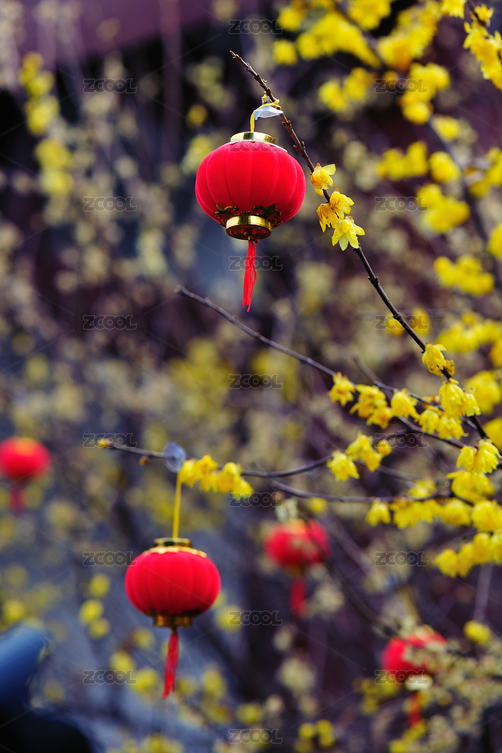 冬日里美丽的腊梅花和迎春的红灯笼