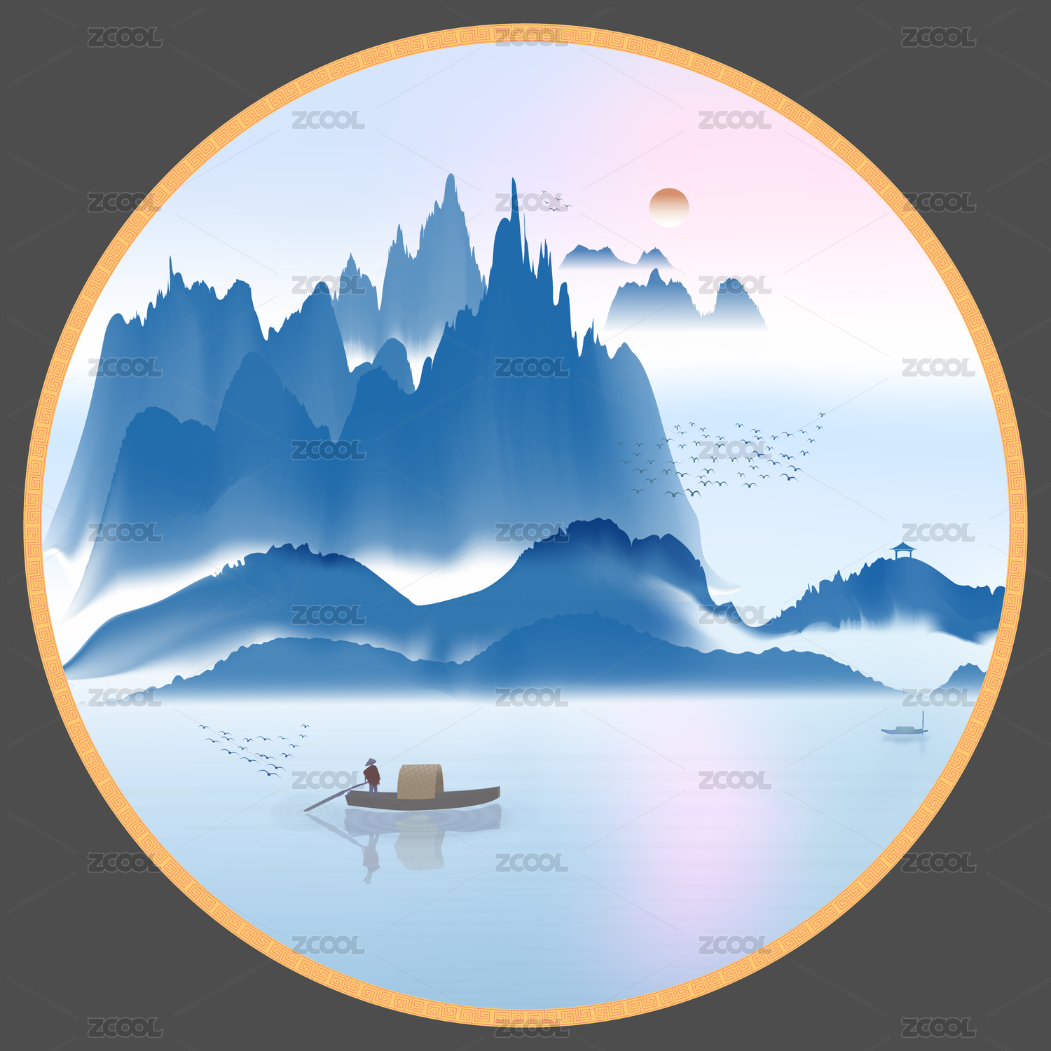 高山湖水圆形意境水墨装饰矢量分层背景图