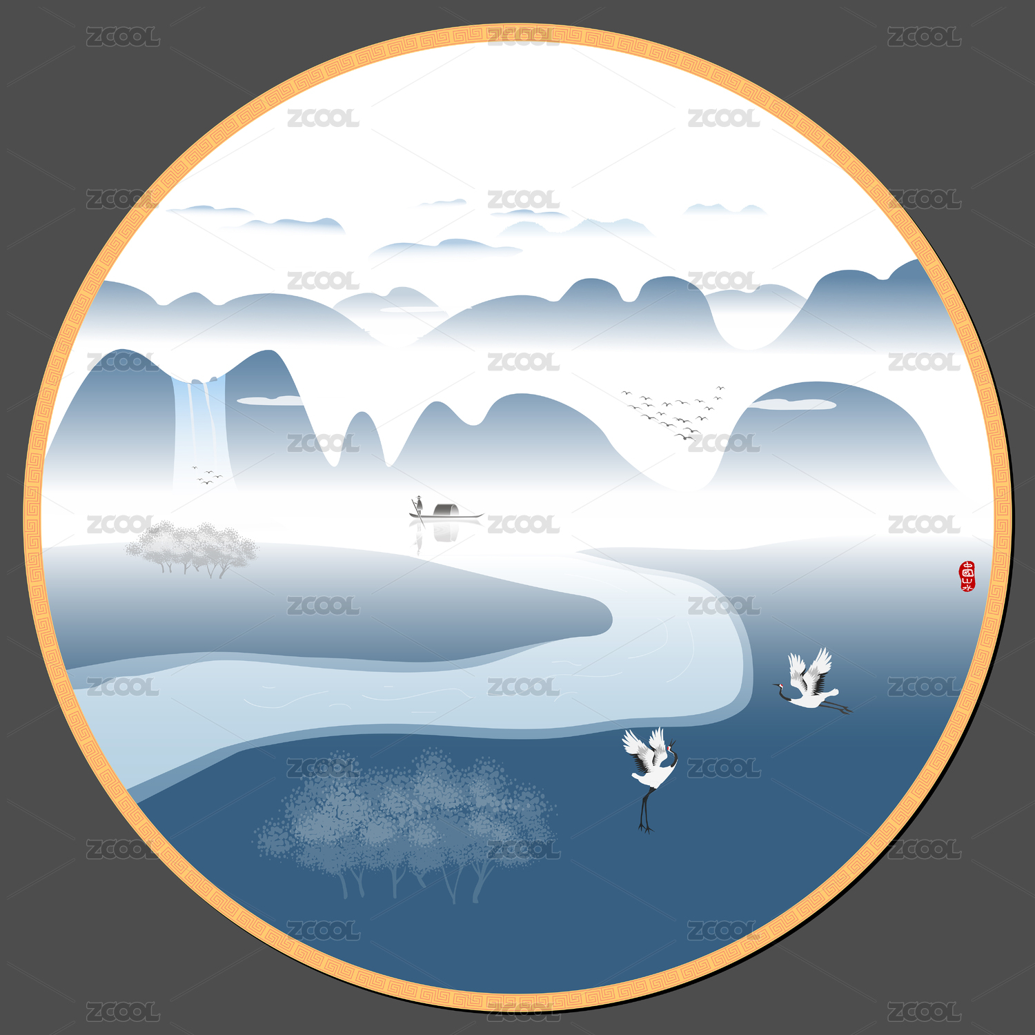 圆形小品意境山水新中式水墨装饰矢量背景图