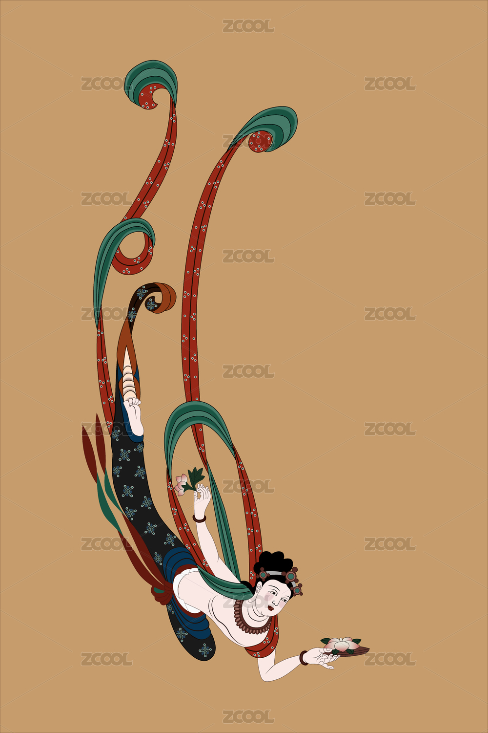敦煌壁画持花飞天矢量图