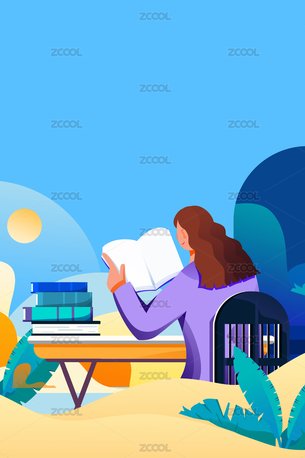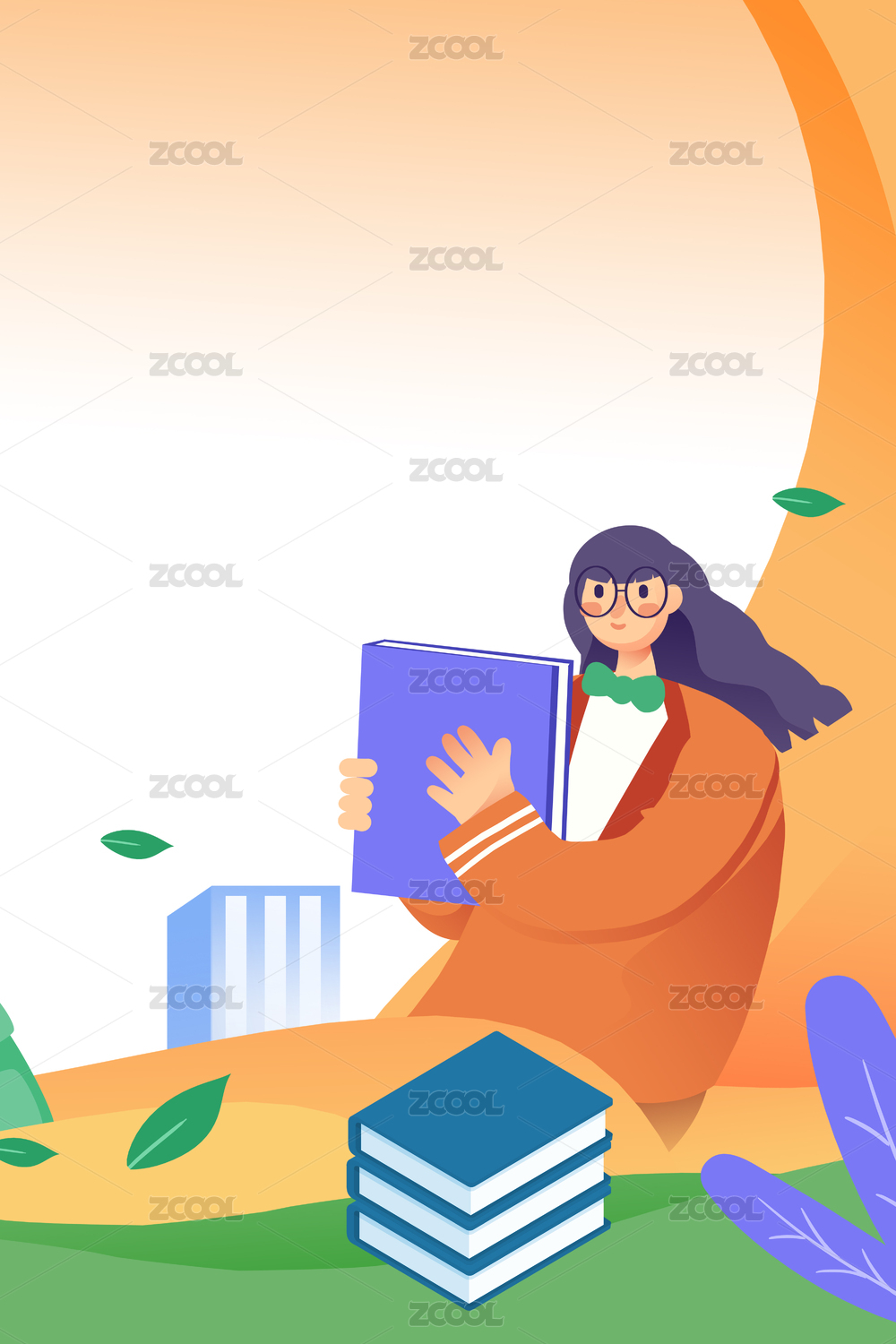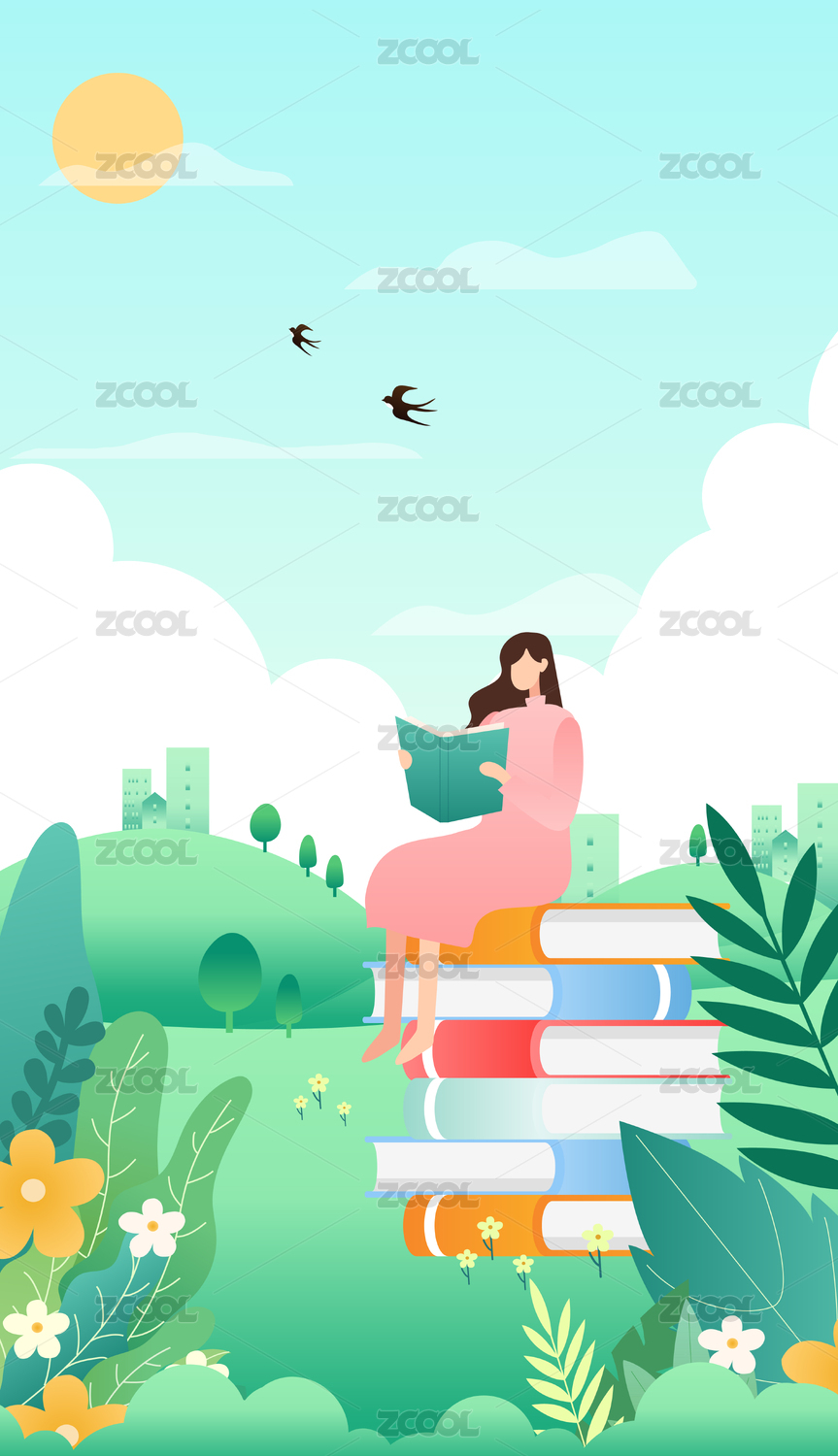 矢量插画坐在书堆上看书阅读学习书本的女孩