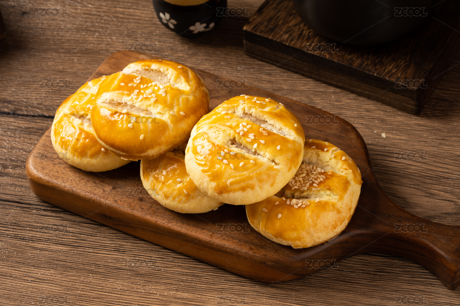 放在榉木砧板上的蛋黄酥