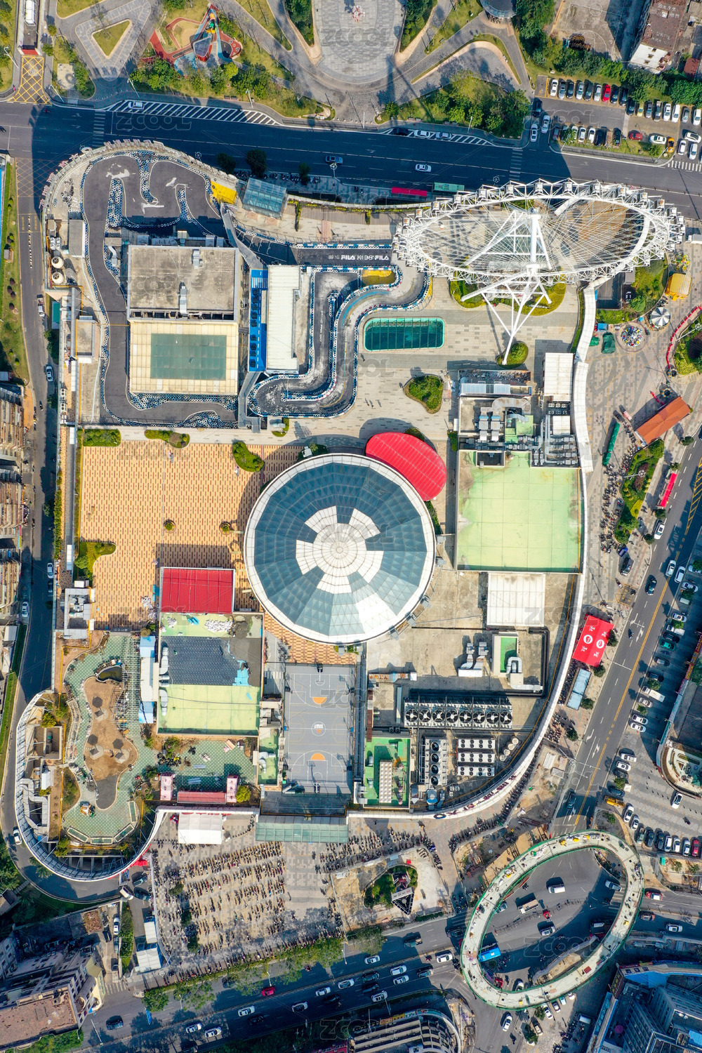 航拍俯瞰中国四川成都高新区银泰城楼顶的运动场