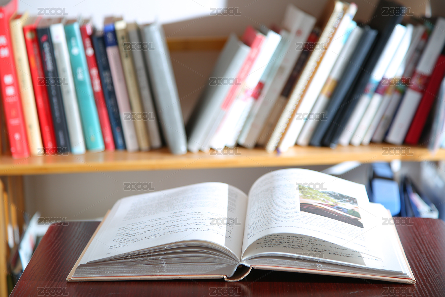 书架和放在桌子上的书本