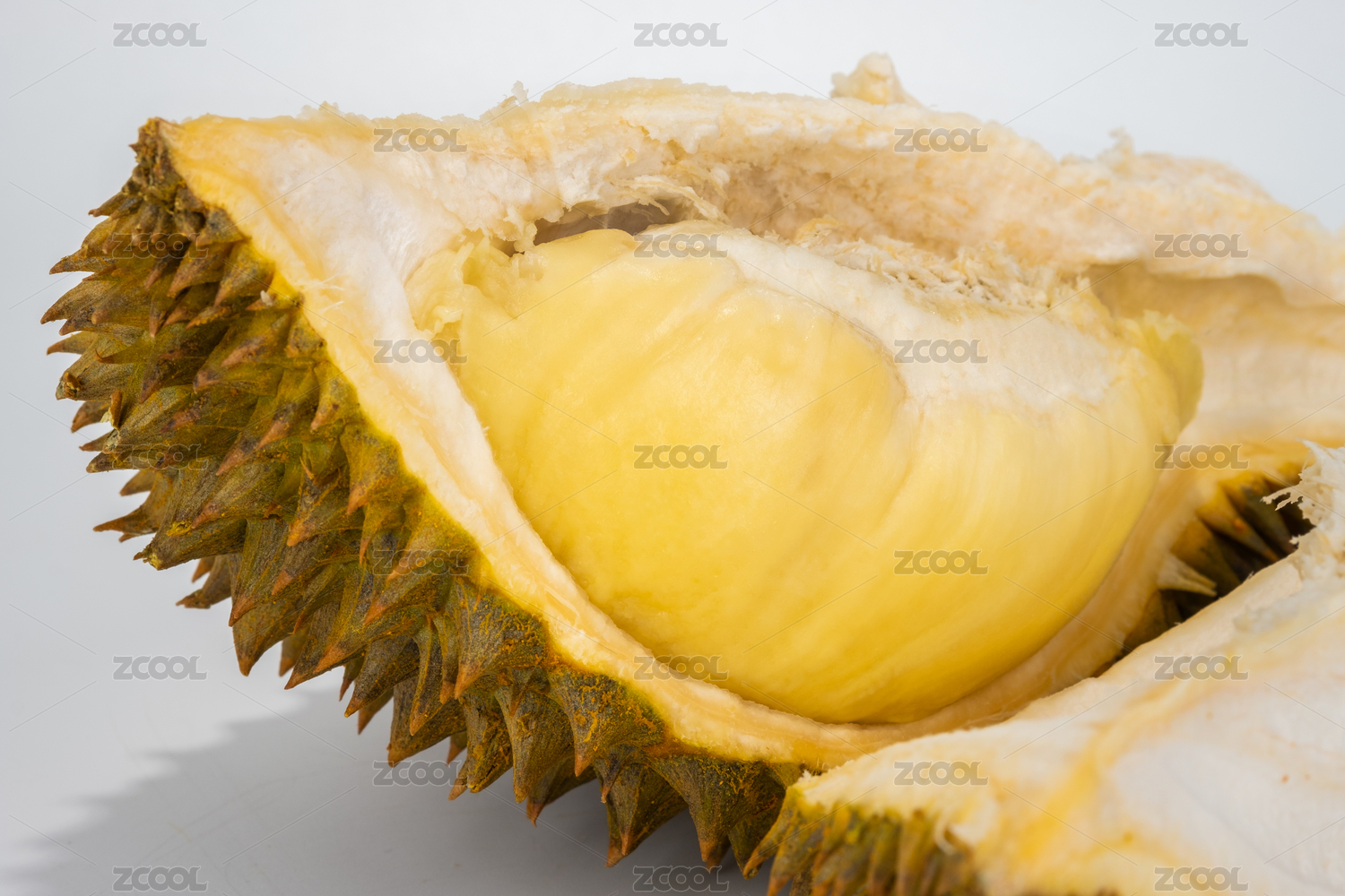 白底上剥开的半个金枕榴莲露出饱满果肉