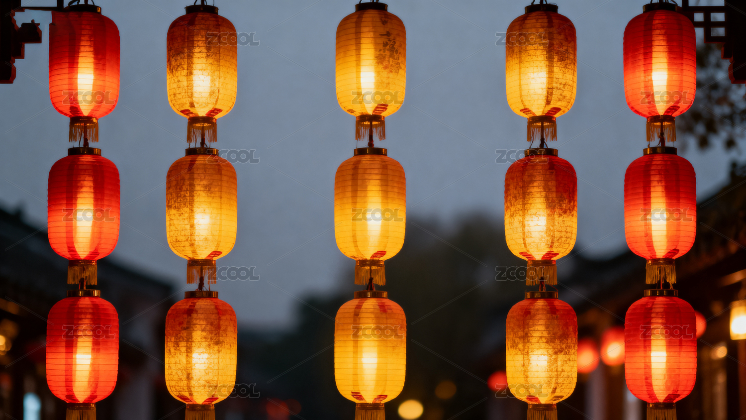 夜幕下红黄灯笼高挂