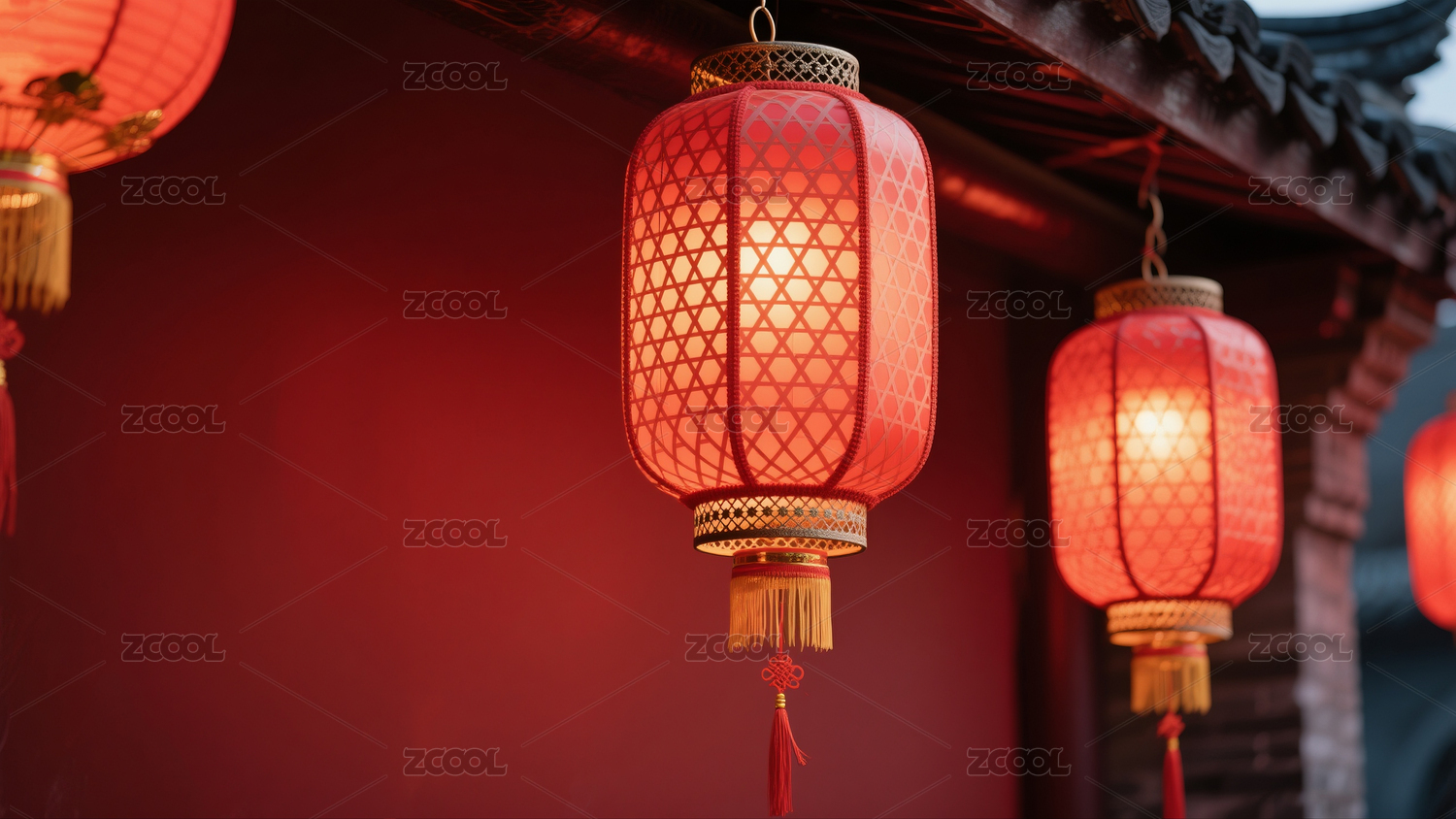 多盏红色镂空灯笼在红色背景前悬挂点亮