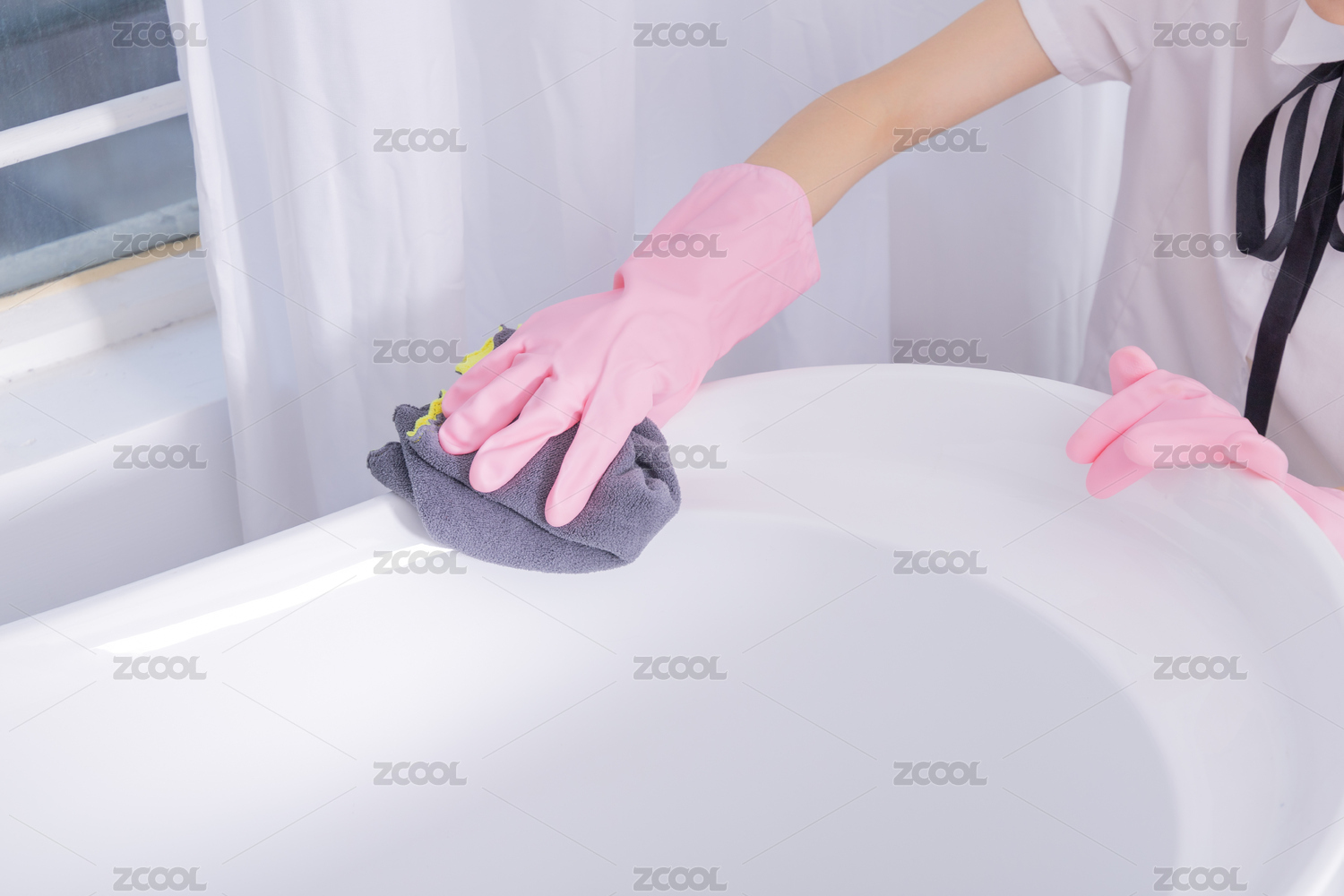 东方女性学生带着手套清洁浴缸 打扫室内卫