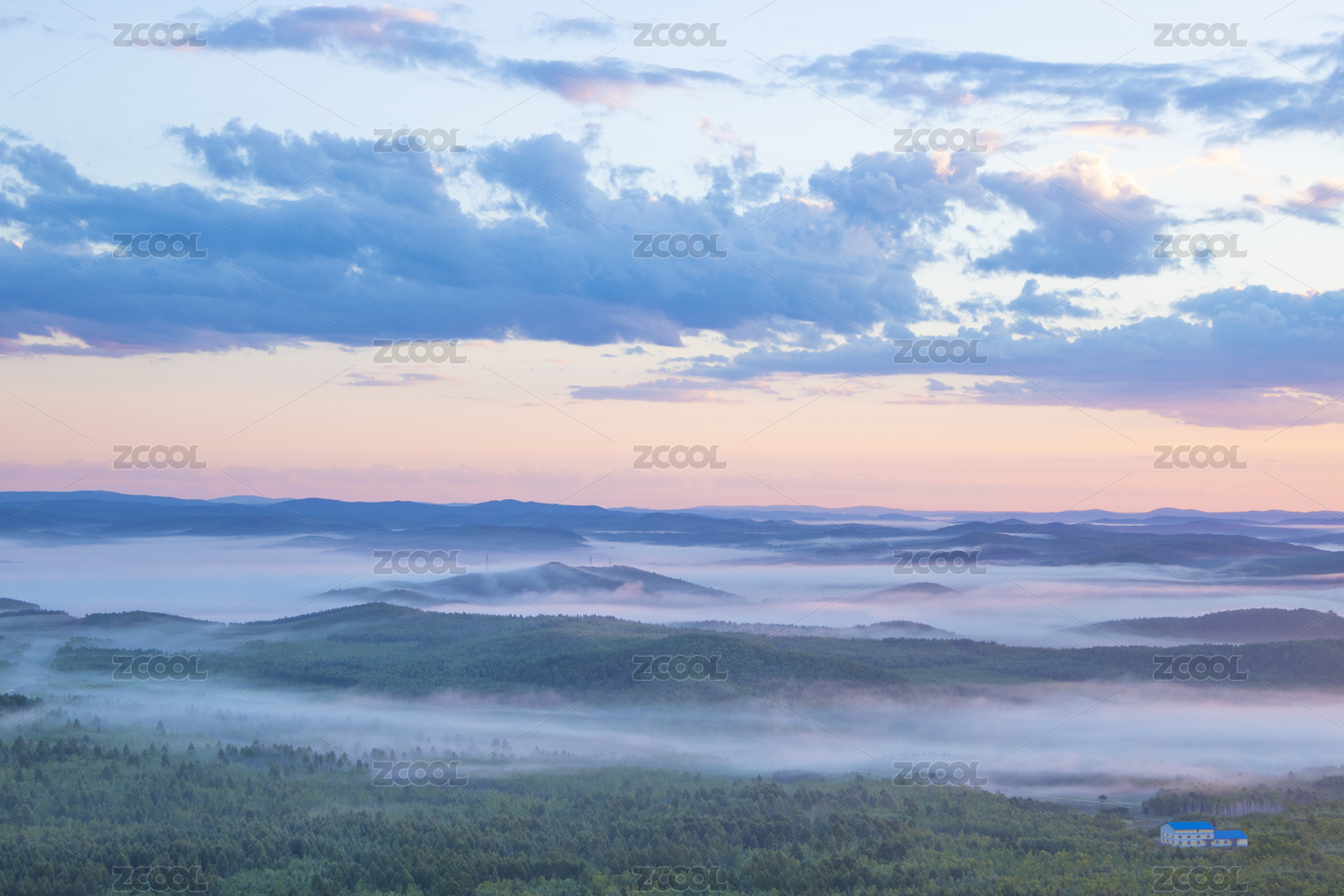 中国大兴安岭日出时的云雾与原始森林